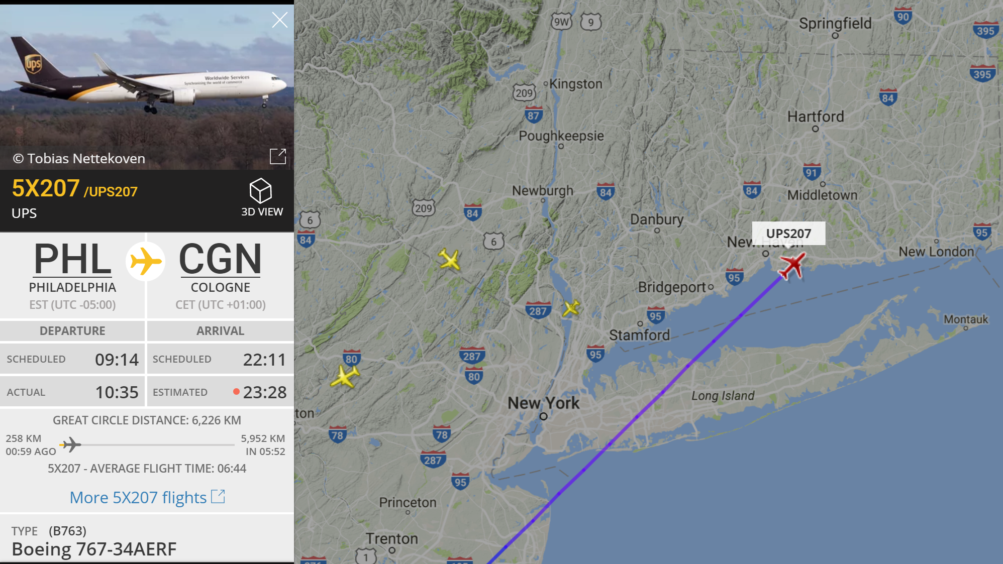 One of the few planes passing through the area is a UPS cargo flight from Philadelphia (PHL) to Cologne, Germany (CGN), located next to New Haven at the time of the snapshot.