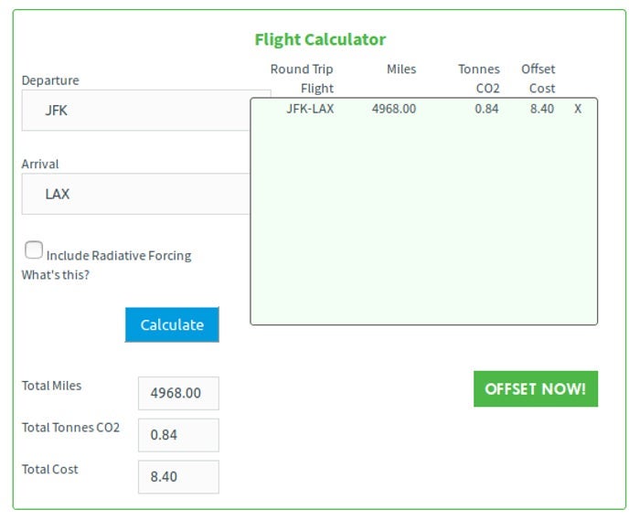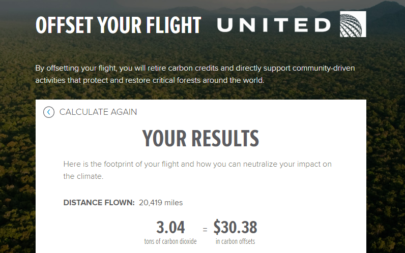 United's calculator estimates the carbon footprint of flying specific routes, although you can also simply choose to offset a set number of flight miles. To offset round-trip flights between New York (EWR) and Los Angeles (LAX), you could donate $7.48 to offset the 0.75 tons of carbon dioxide allocated to your economy seat on those flights.