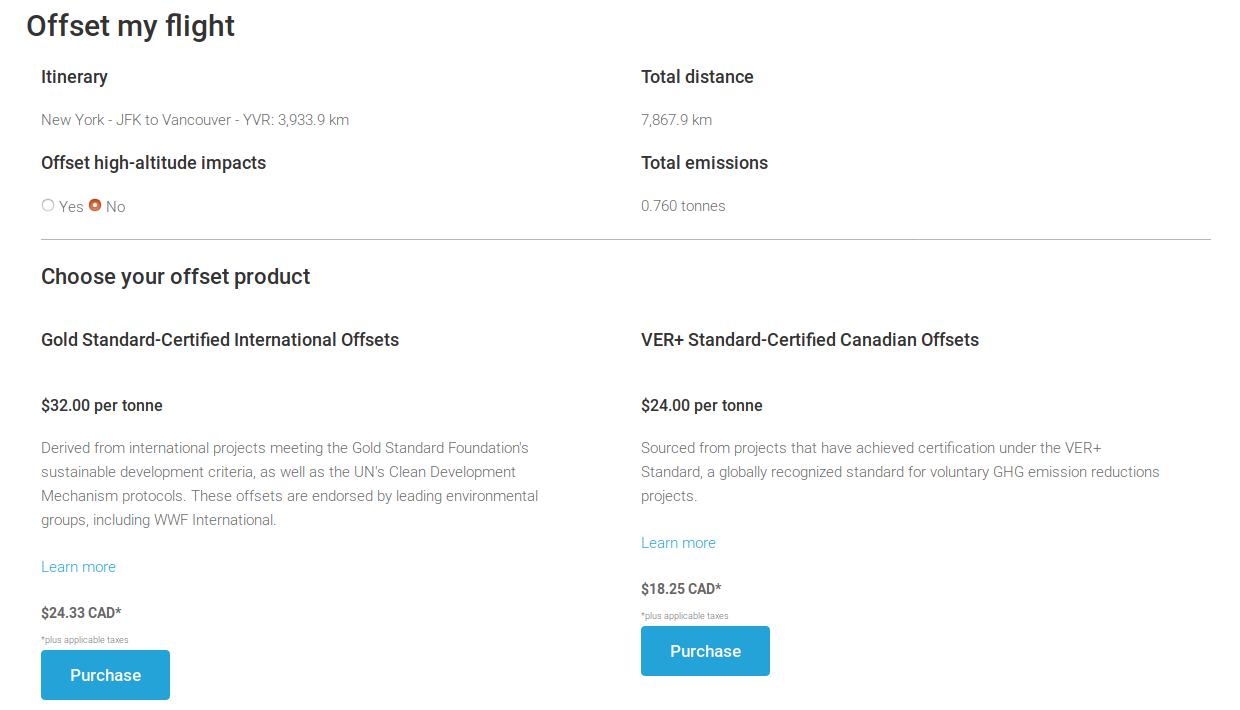 The Air Canada calculator estimates that round-trip flights between JFK and Vancouver (YVR) create 0.760 tons of carbon emissions per passenger. It costs CAD 32 ($24) per metric ton to purchase Gold Standard-Certified International Offsets and CAD 24 ($18) per metric ton to purchase VER+ Standard-Certified Canadian Offsets. So, based on their calculator, it costs CAD 24.33 ($18) to use international offsets or CAD 18.25 ($14) to use Canadian offsets to carbon offset these flights.