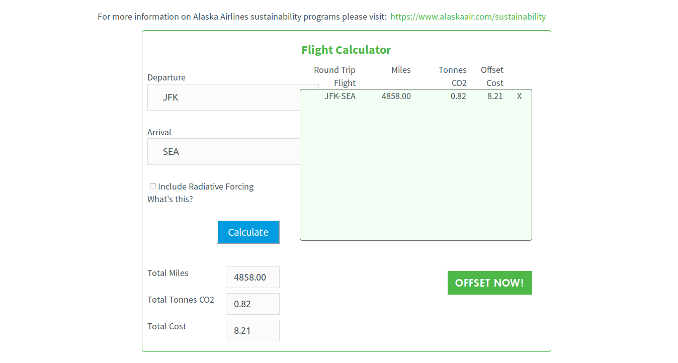 Alaska Airlines customers can calculate a suggested offset based on their route. To offset round-trip flights between JFK and SEA, a donation of $8.21 is recommended.