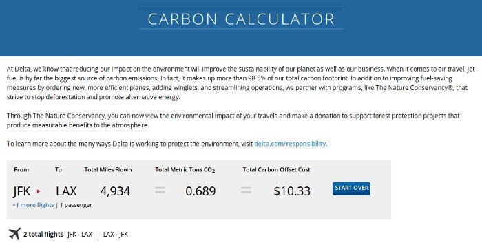 To offset round-trip flights between JFK and LAX, a donation of $10.33 is recommended. Delta also provides the ability to donate miles to The Nature Conservancy, but doesn't suggest a particular number of miles to offset specific flights.