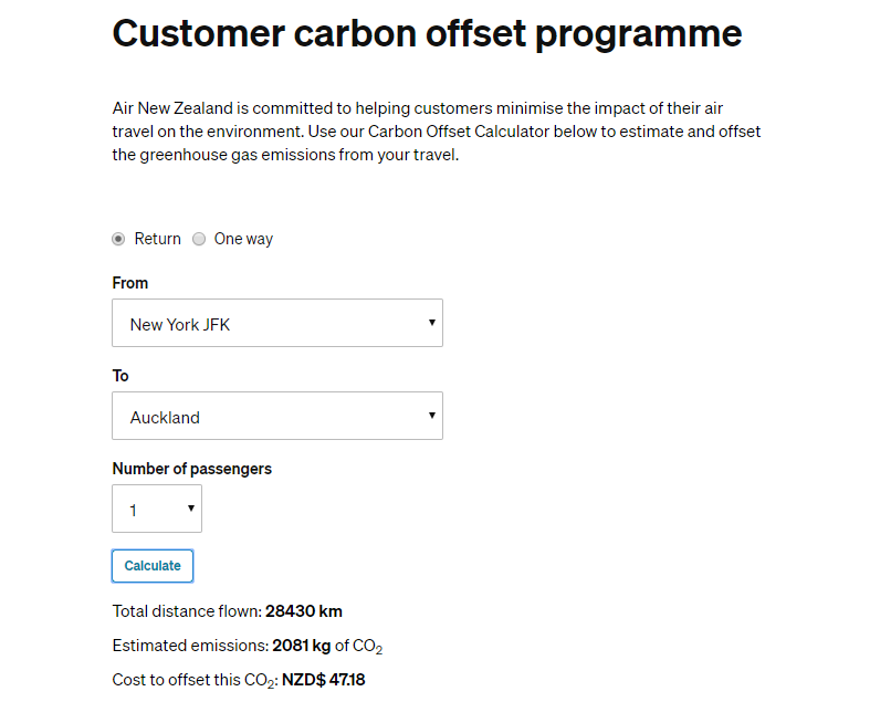 The Air New Zealand calculator estimates that round-trip flights between JFK and Auckland (AKL) create 2,081 kilograms of carbon emissions per passenger. Based on their calculator, it costs NZD 47.18 ($30) to carbon offset these flights.
