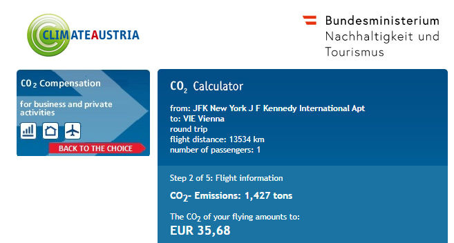 The Climate Austria calculator estimates that round-trip flights between JFK and Vienna (VIE) create 1.427 tons of carbon emissions per passenger. Based on their calculator, it costs €35.68 ($39) to carbon offset these flights.