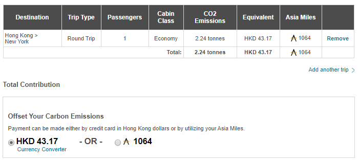 For round-trip flights between JFK and Hong Kong (HKG), Cathay Pacific's carbon emissions calculator allocates 2.24 metric tons of carbon emissions per economy seat, 2.8 metric tons per premium economy seat, 3.36 metric tons per business class seat and 4.48 metric tons per first class seat. The carbon offset price is set at HKD 19.27 ($2) per metric ton or 475 Asia Miles per metric ton, so an economy class seat can be offset for HKD 43.17 ($6) or 1,064 Asia Miles. This values Asia Miles at 0.52 cents while TPG's latest valuation values Asia Miles at 1.3 cents.