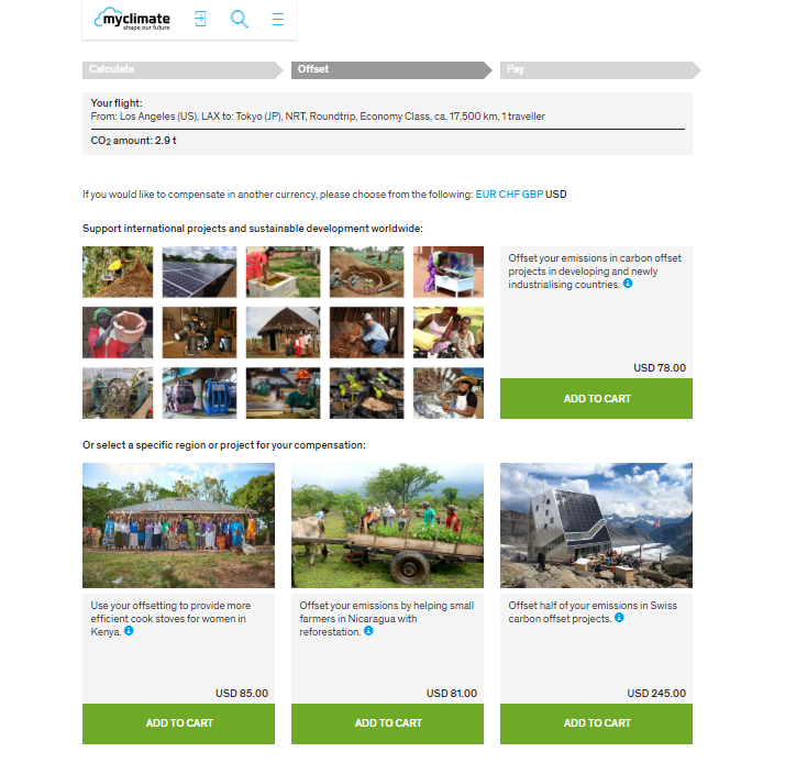 Japan Airlines directs passengers to myclimate if they wish to offset their flights. The myclimate calculator considers your route and class of service. For round-trip flights between LAX and Tokyo Narita (NRT), a seat in economy is allocated 2.9 tons of carbon emissions, a seat in business is allocated 5.5 tons and a seat in first is allocated 8.5 tons. The 2.9 tons allocated to an economy class seat can be offset by a $78 donation to international projects and sustainable development worldwide, or you can donate a larger sum of money toward a specific region or project.