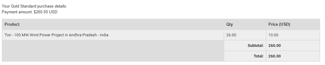 Samantha Rosen flew 21,665 miles for that mileage run competition. According to BlueSkyModel's air mile model, this mileage run created an estimated 2.36 metric tons of carbon emissions. TPG offset Samantha's flights by purchasing carbon offsets on the Gold Standard website that would offset a range of Gold Standard certified projects at a cost of $11 per metric ton. Gold Standard only sells offsets by the metric ton, so we purchased $33 of offsets using the Chase Ink Business Preferred Credit Card. The purchase coded as Gifts and donations, so we only earned 1 point per dollar spent.