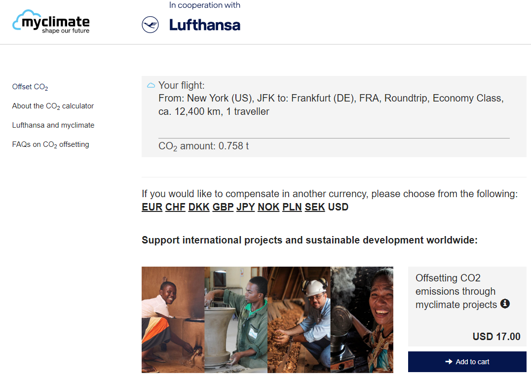 Myclimate's calculator for Lufthansa allocates different carbon emissions to passengers in economy, premium economy, business and first. For round-trip flights between JFK and Frankfurt (FRA), Myclimate's calculator allocates 0.758 tons of carbon emissions to economy passengers, 1.1 tons to premium economy passengers, 1.6 tons to business class passengers and 2.4 tons to first class passengers. It costs $17 to offset the 0.758 tons of emissions allocated to an economy class seat.