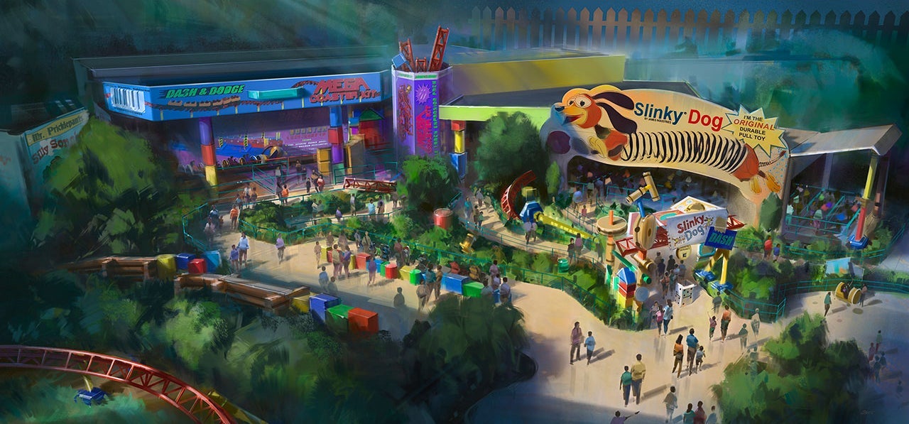 Opening this summer at Disney's Hollywood Studios in Bay Lake, Florida, Toy Story Land builds on the crazy popularity of the Toy Story Midway Mania! ride with two more attractions from Andy's house: the Slinky Dog Dash coaster and a rocketship ride called Alien Swirling Saucers (if you're lucky, you might get chosen by the claw!).