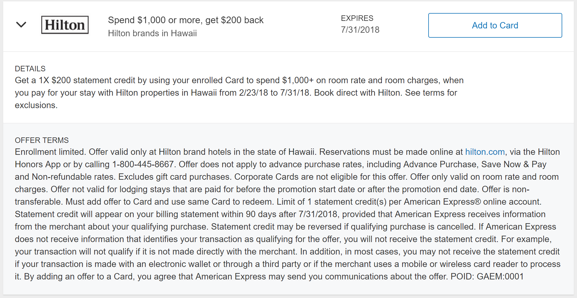 The details for each offer vary. In order to take advantage of this one, you need to register for the offer on a targeted American Express card, book a stay directly with Hilton and pay for the stay with the registered card by July 31, 2018. If the total cost of the room rate and room charges exceeds $1,000, you'll get a $200 statement credit from American Express. If you're not interested in staying at a Hilton in Hawaii, check your Amex Offers for deals with other hotel brands.