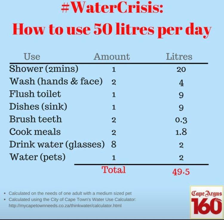Cape Town is currently in the midst of a severe drought crisis, the worst in over a century. In recent weeks, city officials implemented a water restriction policy which limited each resident to 87 liters (or 23 gallons) of household water usage per day.