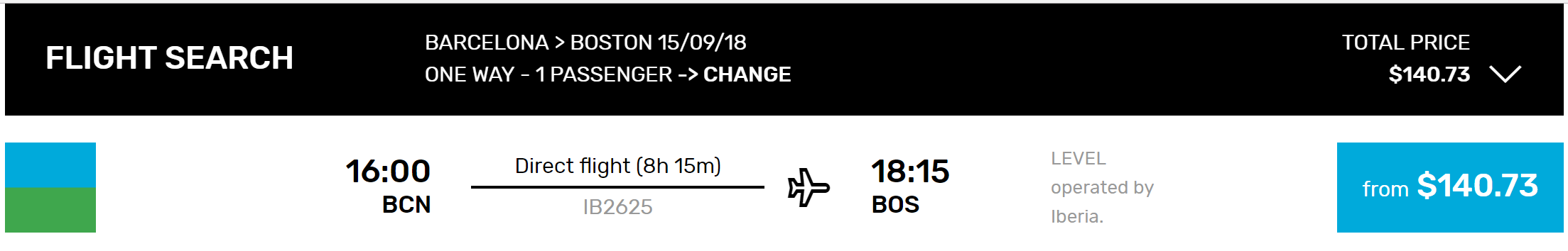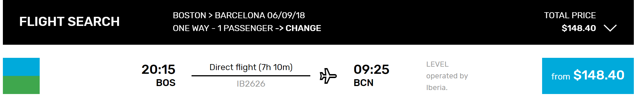 Boston (BOS) to Barcelona (BCN) for $289 ($148 + $141) nonstop on LEVEL: