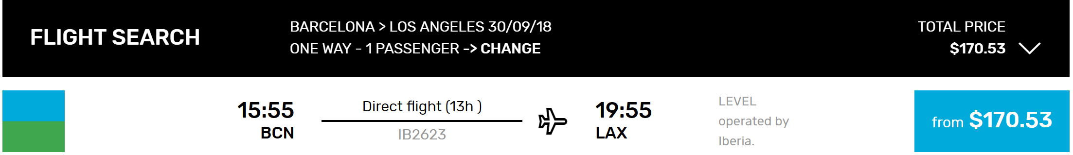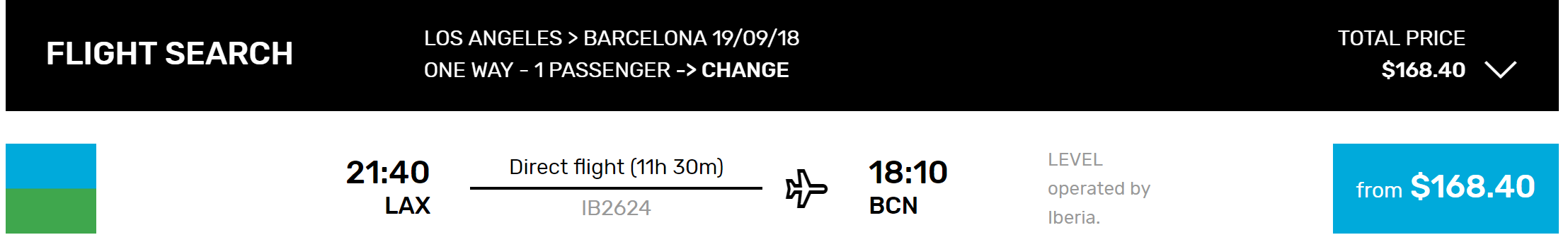 Los Angeles (LAX) to Barcelona (BCN) for $339 ($171 + $168) nonstop on LEVEL: