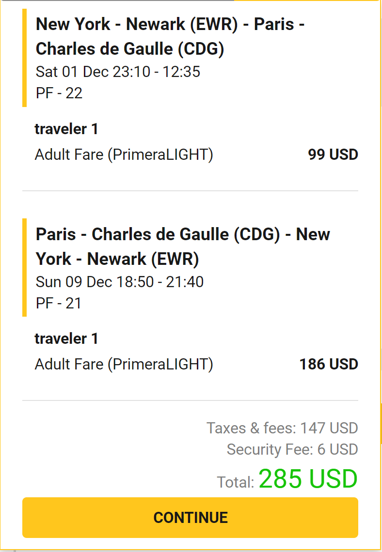 Newark (EWR) to Paris (CDG) for $285 round-trip nonstop on Primera Air: