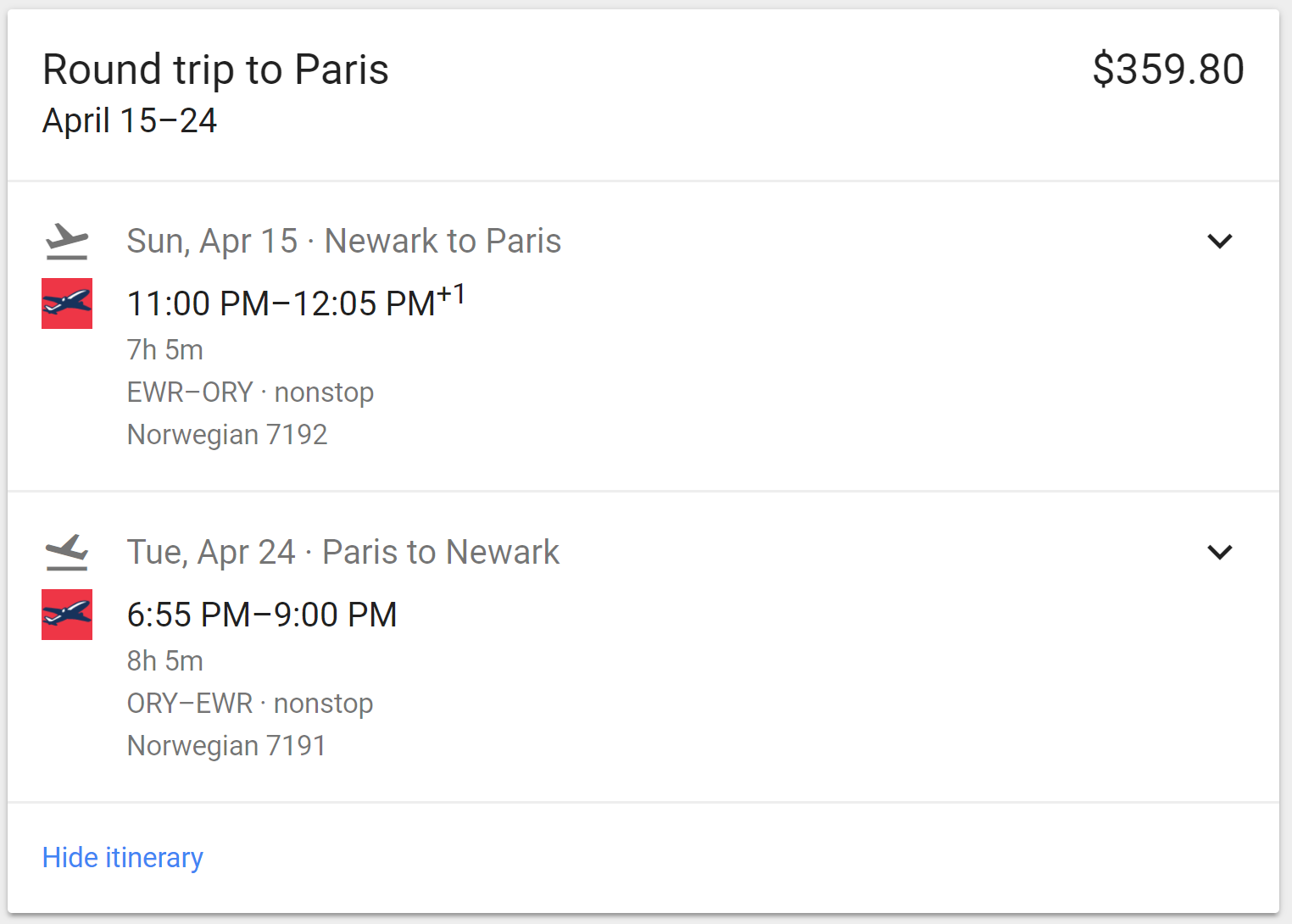 Newark (EWR) to Paris (ORY) for $360 round-trip nonstop on Norwegian: