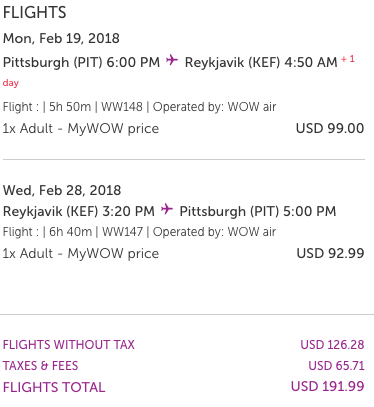 Pittsburgh (PIT) to Reykjavik (KEF) for $192 round-trip on WOW: