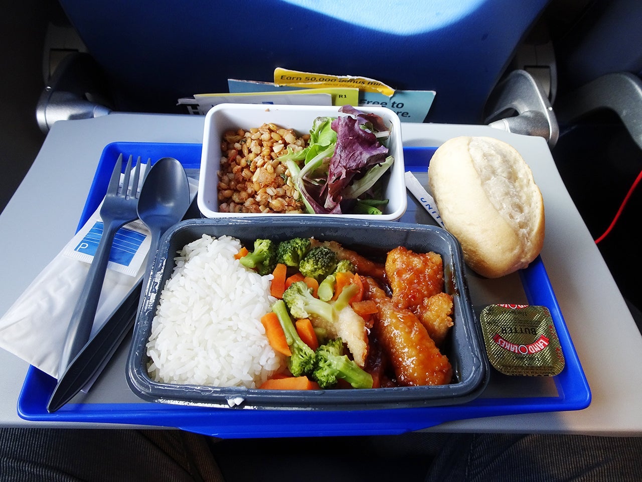 40 minutes after takeoff, I was offered lunch, a choice of "General Tao" (perhaps a relative of General Tso?) chicken with vegetables and rice or stir-fry vegetables and noodles. I opted for the chicken, which was much more pleasant-looking than the foil wrapping suggested. Six pieces of heavily breaded chicken were hot and rather flavorful, with a hint of spice. I ate them all. They were joined by hot and overcooked tiny broccoli and carrots and white rice that was bland but somehow cooked perfectly. While hardly gourmet, I've had worse at Chinese buffets in food courts.