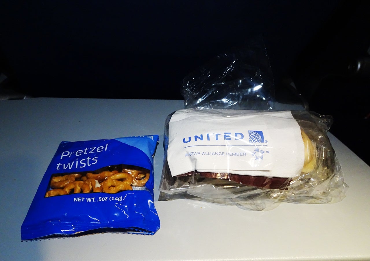 It was another 4.5 hours later when a snack came: a turkey sandwich and pretzels with a packet of a dozen plain M&M's, followed by more drinks. The sandwich was okay, but with only one slice of turkey and one slice of swiss cheese, not very filling. Fortunately I found more sandwiches and M&M's in the galley.