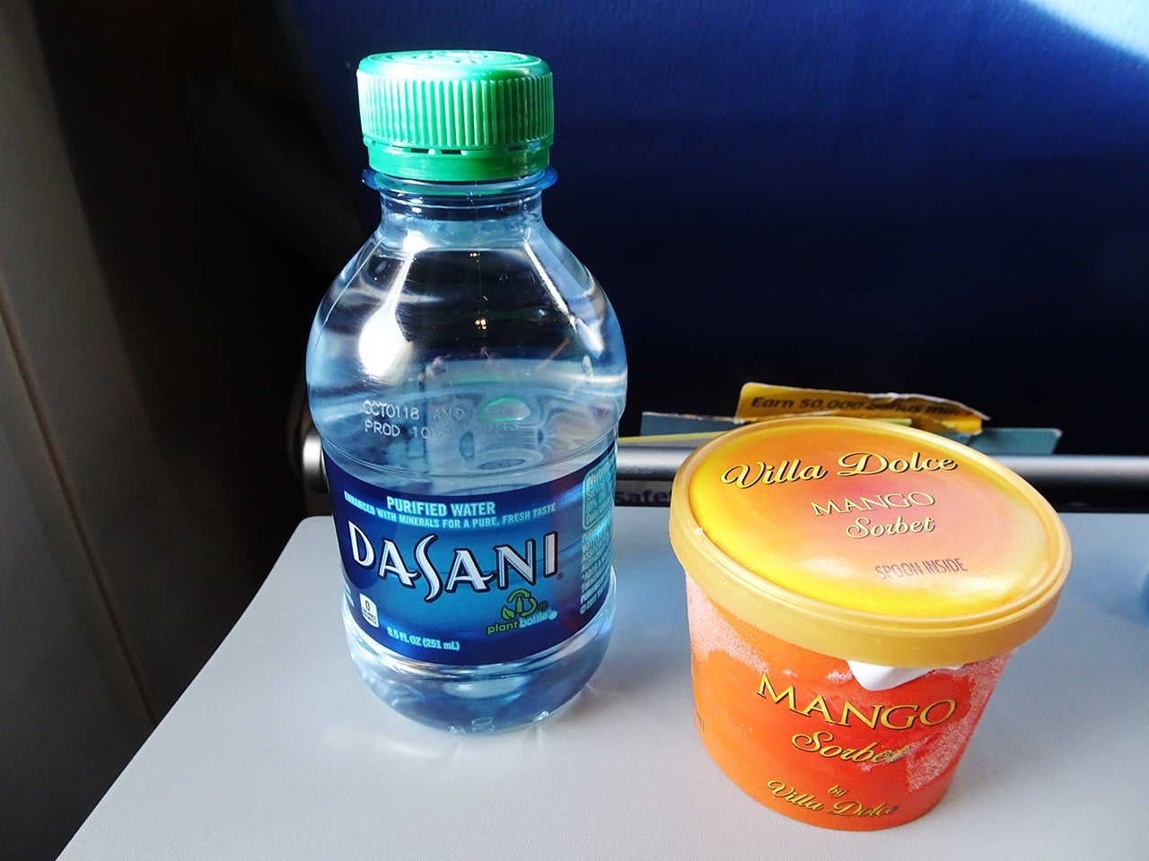20 minutes later I was served a mango sorbet and bottled water. I missed the vanilla ice cream I'd had on previous flights, but this was fine. All was collected 15 minutes later.