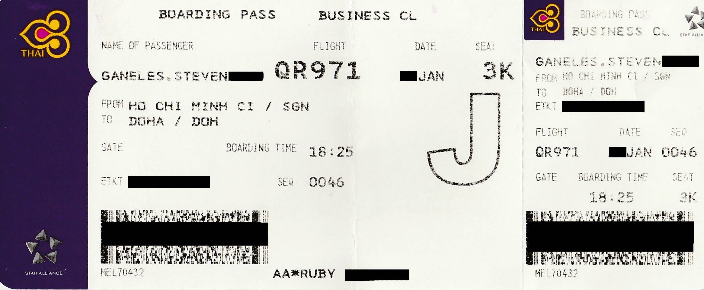 When I arrived at MEL, my first stop was the Qatar check-in desk. I asked the agent for my connecting boarding passes from Ho Chi Minh. Unfortunately, Qatar was unable to issue the boarding passes but the agent did suggest I ask Thai to check my baggage all the way through to JFK, as the two airlines have a baggage service agreement. An agent at the Thai Airways check-in counter made a few phone calls and verified the baggage services agreement. The agent then checked my onward connections and issued luggage tags that read BKK-SGN-DOH-JFK. Finally, the Thai agent issued me my boarding cards for my Thai flights. Again to her surprise and mine a boarding card for my flight from SGN-DOH, a Qatar Airways flight, printed from her machine as well on the Thai card stock. When I arrived at JFK 58 hours later, my bag was waiting for me.