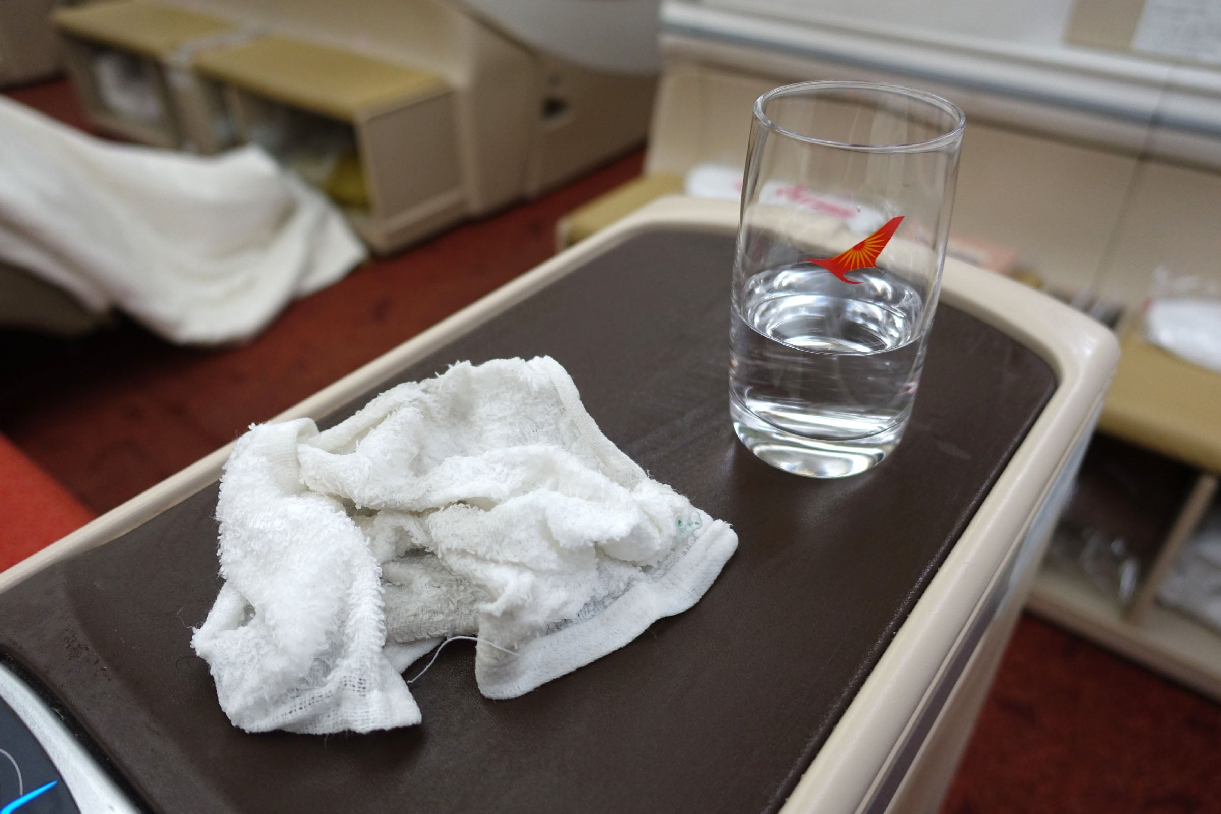 I started with a glass of water, which was presented alongside a warm towel. I used the towel to wipe down the seat a bit, as I had done on my 777 flight. This one wasn't nearly as dirty, but it wasn't sparkling clean, either.