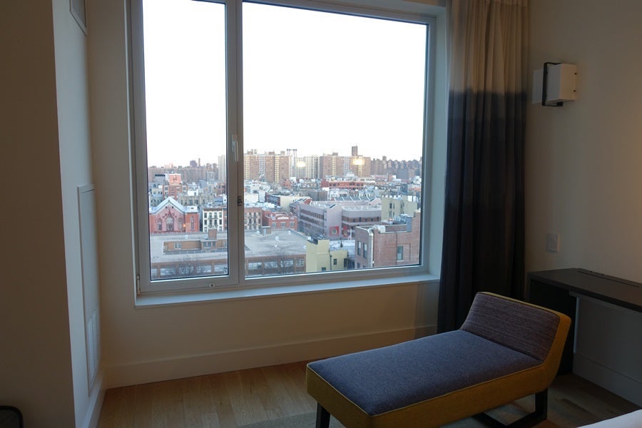 The floor-to-ceiling window had a nice view, and light streamed in each morning — and there were blackout shades to keep the room dark for when I felt like sleeping in. A small sofa let me admire the view out the window. The floors were wood, but there was a funky, decorative rug underneath the sofa.