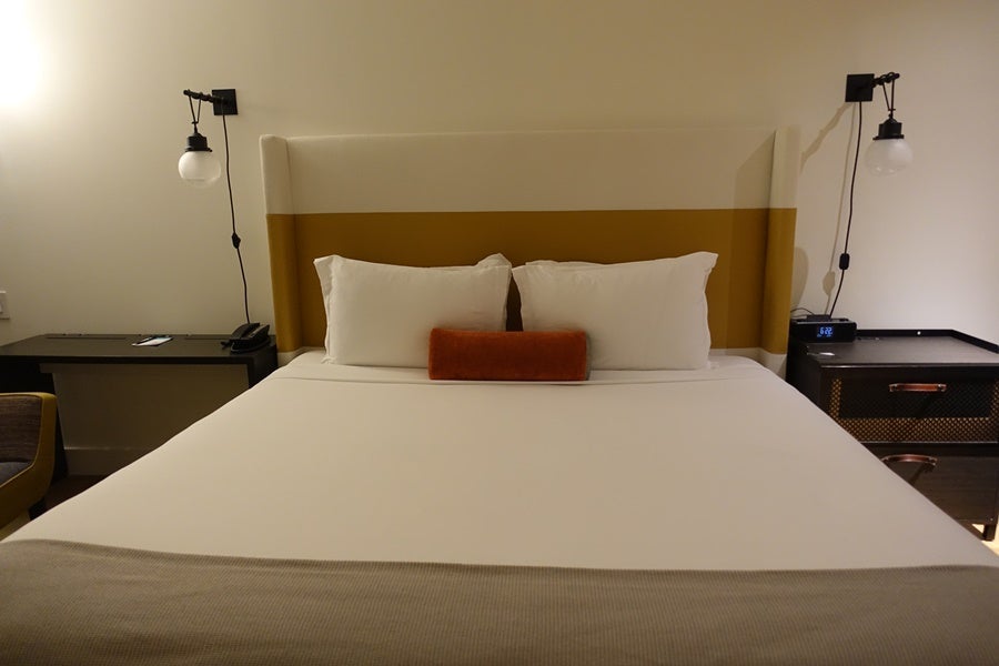 The hallways were vibrant and fun, covered with creative artwork and funky graffiti. I entered my room on the 11th floor and immediately fell in love. The vintage-yet-modern decor was warm and inviting, and my eyes were drawn to the cool, exposed light bulbs on either side of the bed.