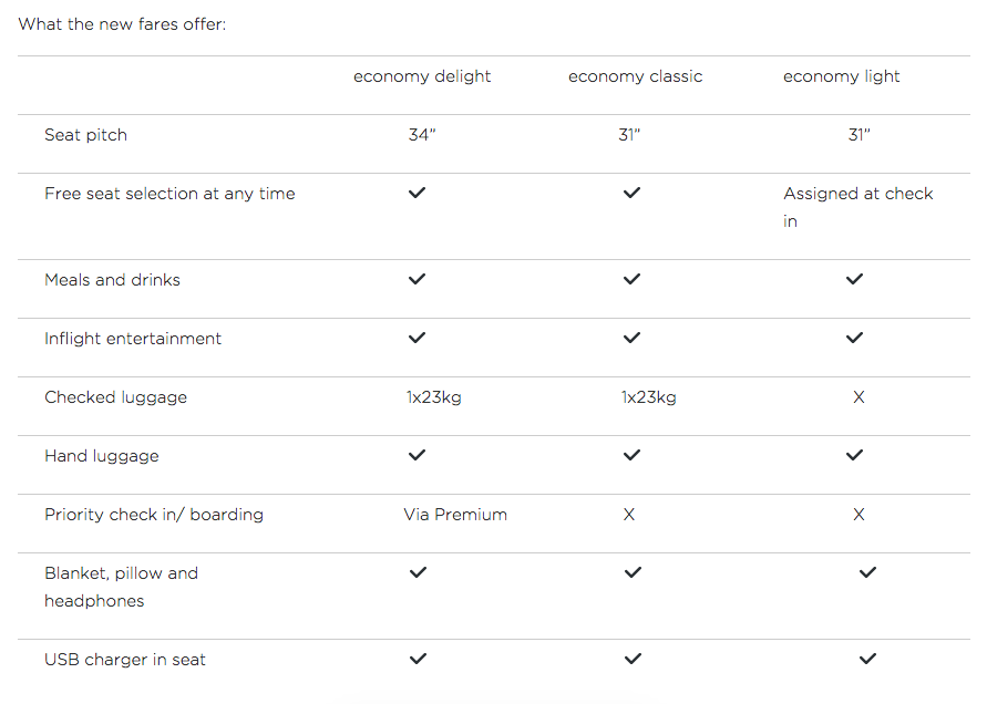"Economy delight" offers passengers three inches of additional legroom over the other two options with a 34-inch seat pitch; priority boarding; checked luggage; and free seat selection.