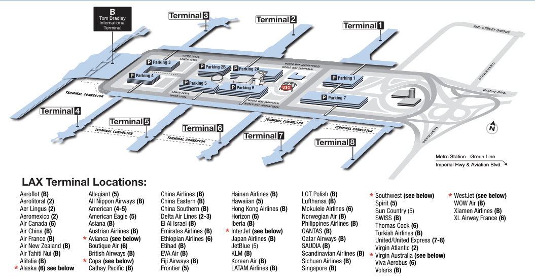 The airport is U-shaped, so Terminal 1 is located across the airport from Terminals 7 and 8, Terminal 2 is across from Terminals 5 and 6, Terminal 3 is located across from Terminal 4, and Tom Bradley International Terminal is down at the very far end.