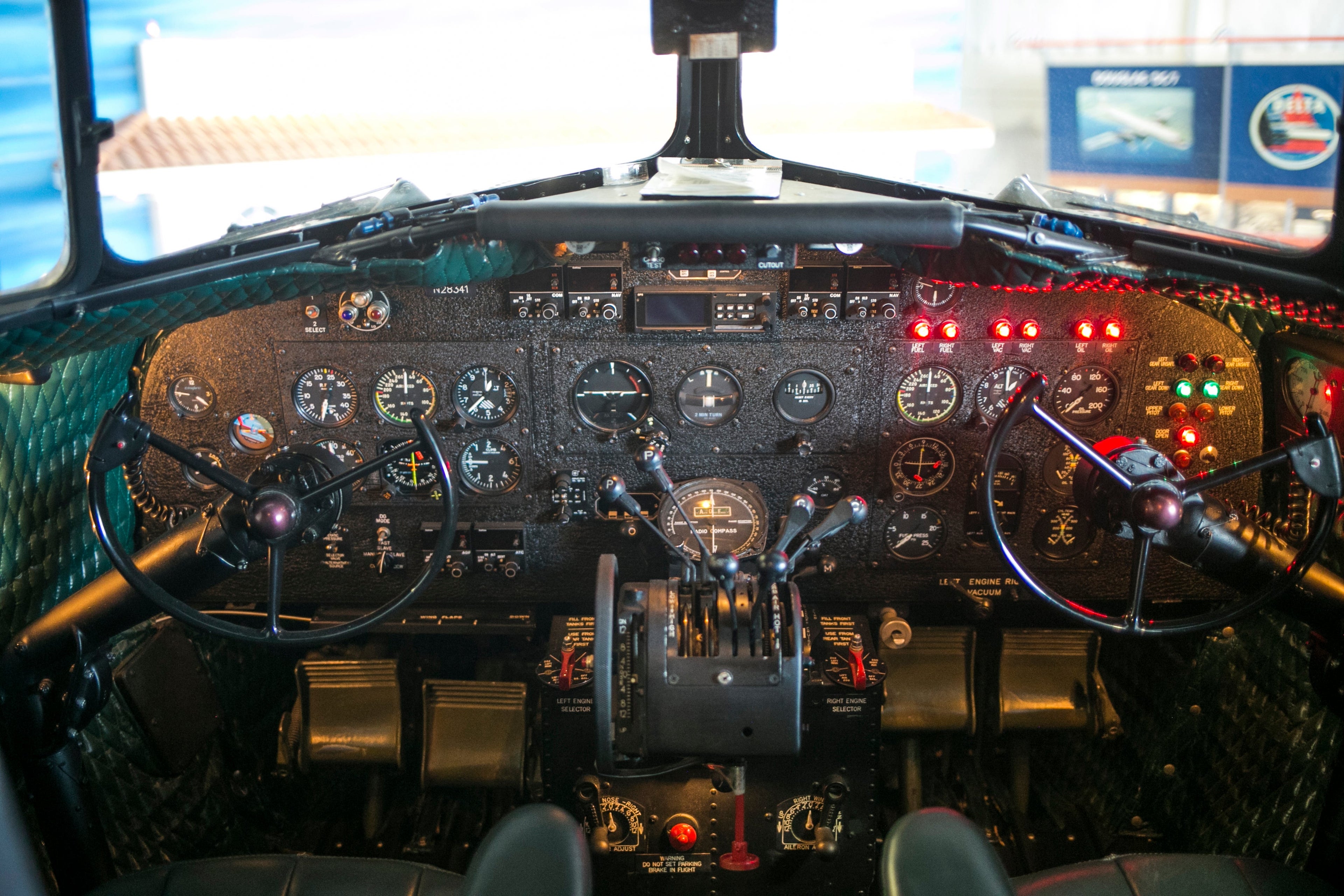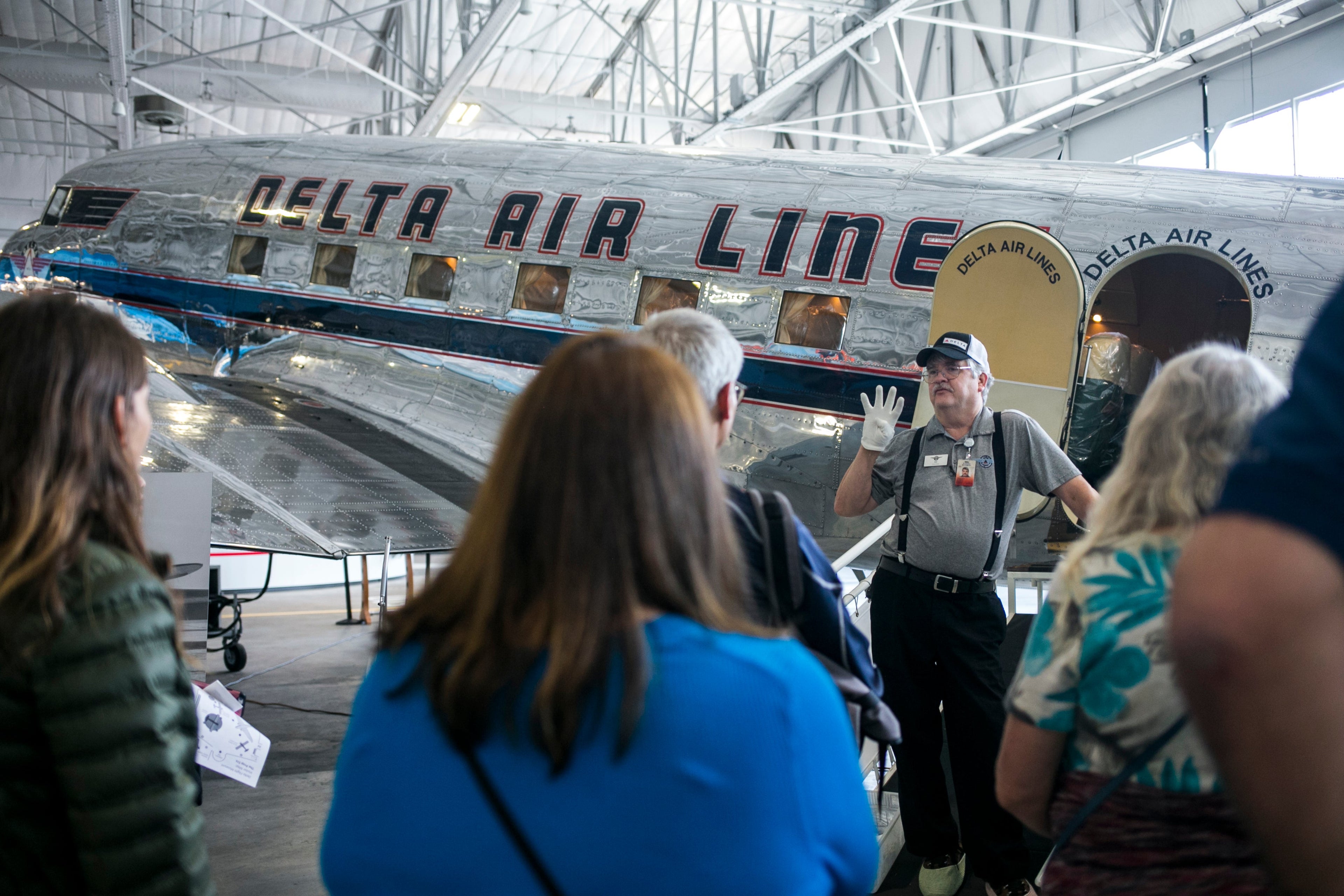 Once a month, the museum cracks open the DC-3 for guests to tour the cabin and flight deck as it was in the 1940s. We donned protective booties and gloves and climbed aboard. (Watch your head). Our tour was led by a volunteer active Delta A320 pilot, and a retired Delta employee, each of whom loved to share their passion for this plane and the airline.