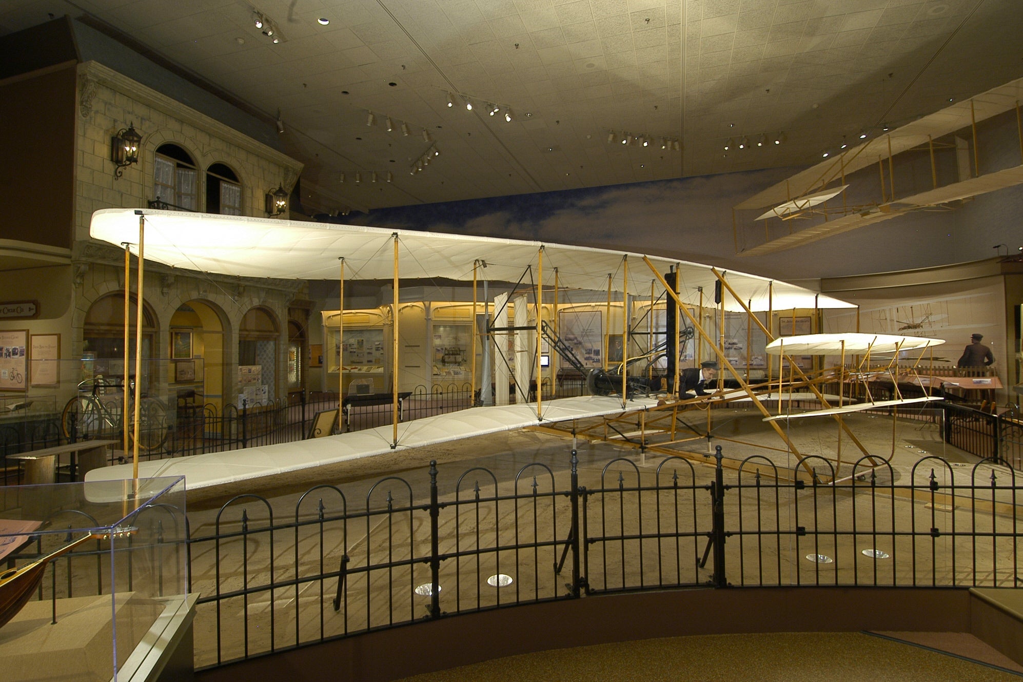 Practically hidden in an alcove of the museum is the original Wright flyer that flew at Kitty Hawk. Yes, the very first heavier-than-air powered airplane with control surfaces. Gaze at it—a wooden kite, covered in canvas—and compare it to where we are today. That first flight was shorter than the tip-to-tail length of a 747.