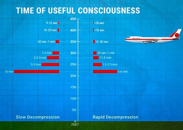 "In every airline training course I've ever taken as a flight attendant, they hammer this Time of Useful Consciousness information into us," Carrie says. "At 35,000 feet, you have 30 seconds before you pass out to get an oxygen mask on."