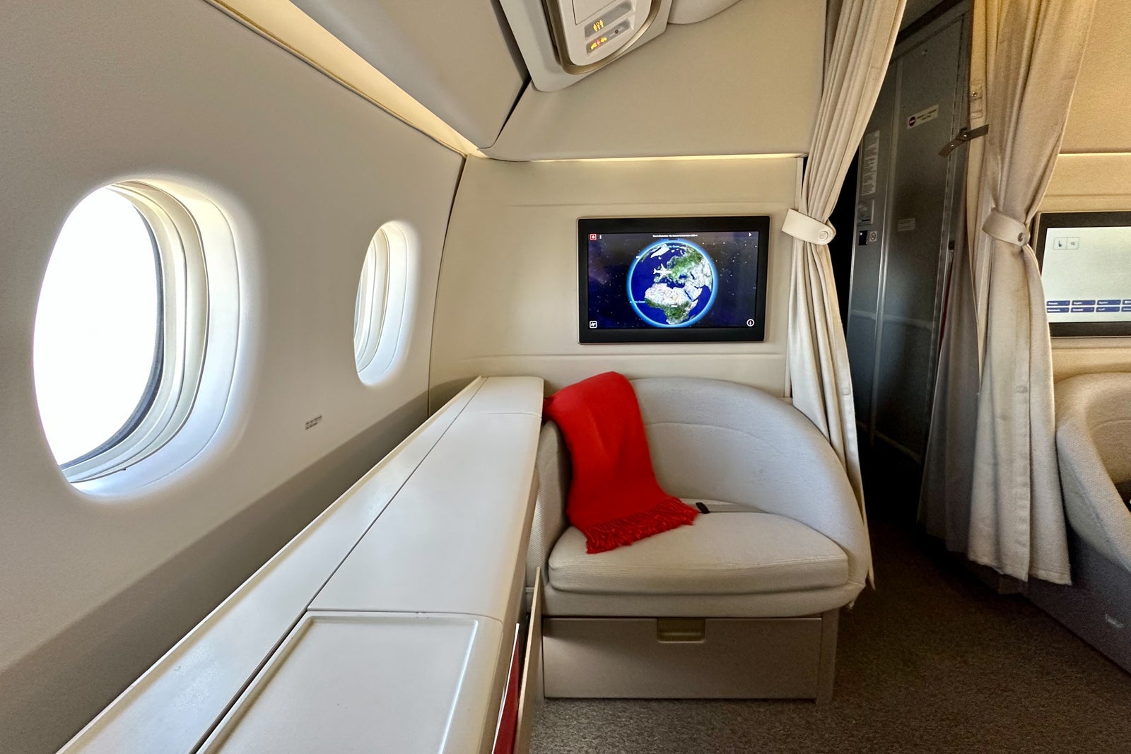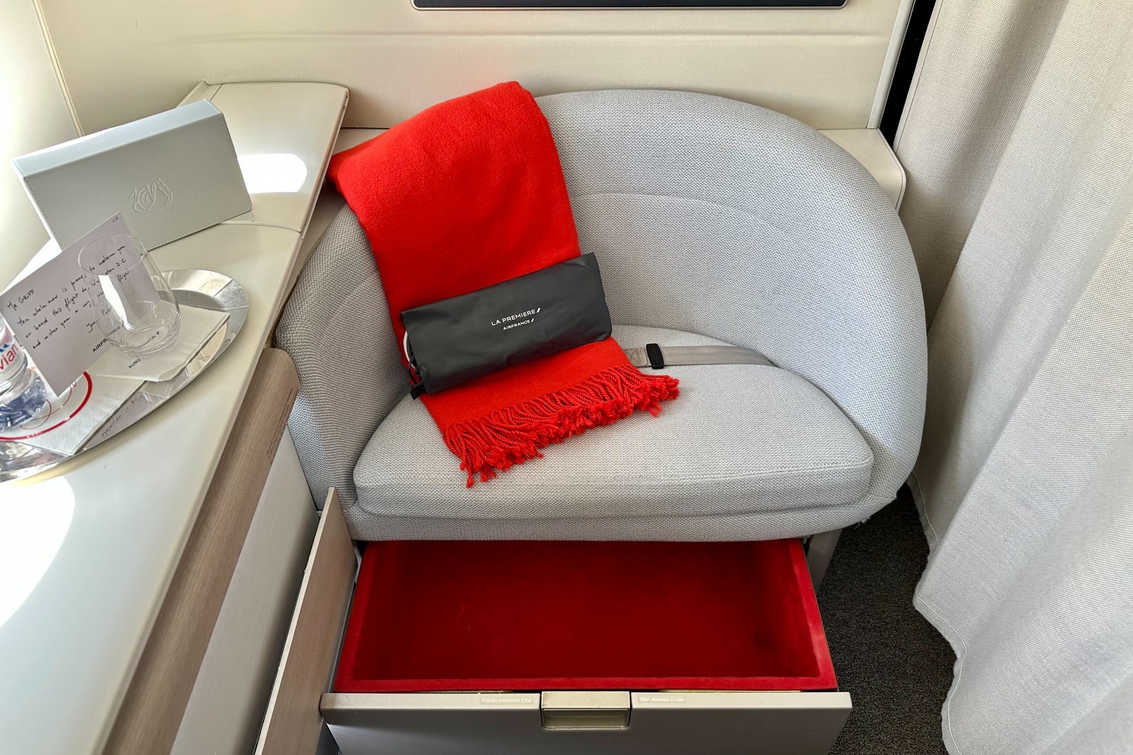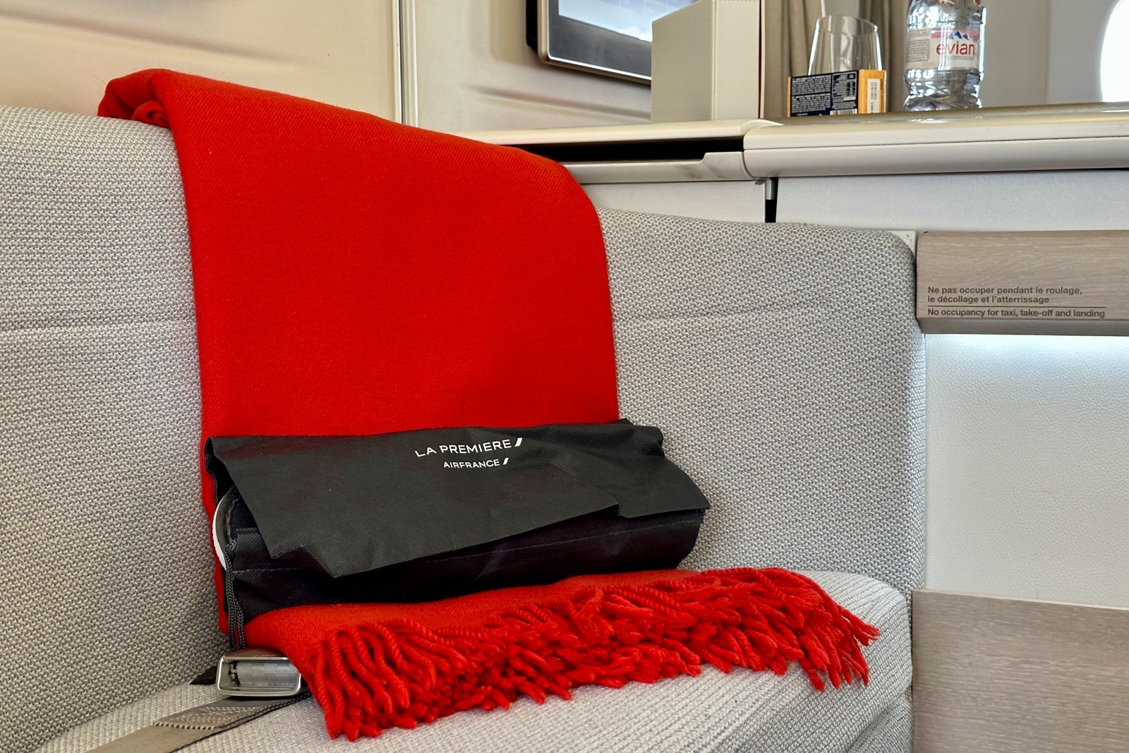 In addition to the amenity kit, I found a chic red blanket carefully draped over my ottoman, along with a La Premiere-branded shoe bag, slippers and shoehorn.