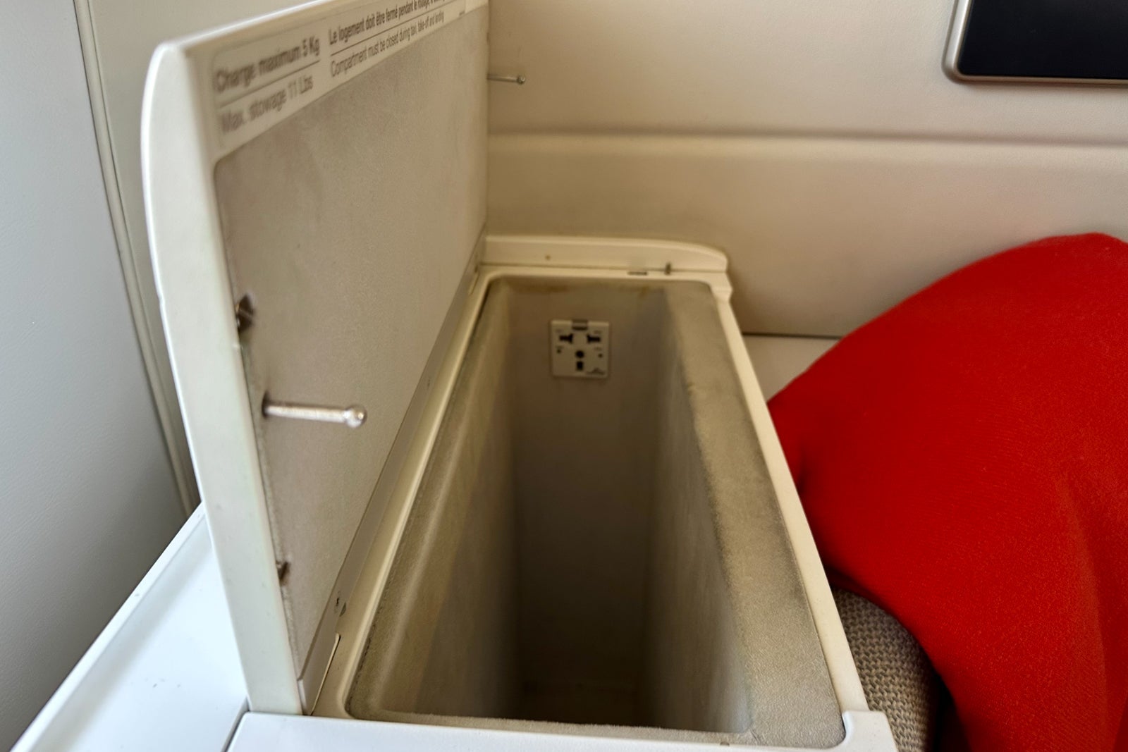 In terms of storage, you'll find a red suede-lined slide-out compartment underneath the ottoman, which can also double as a buddy seat during the flight.