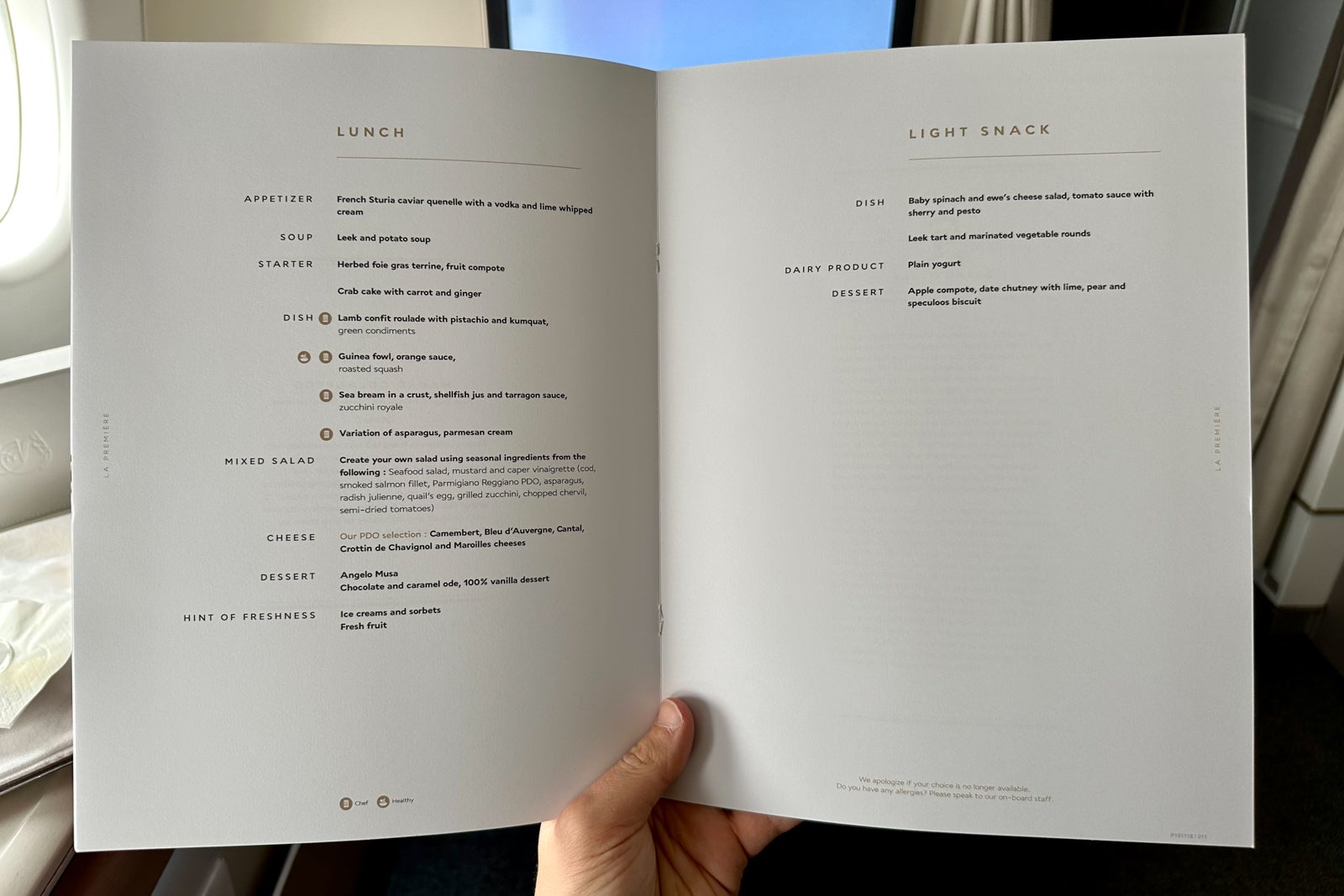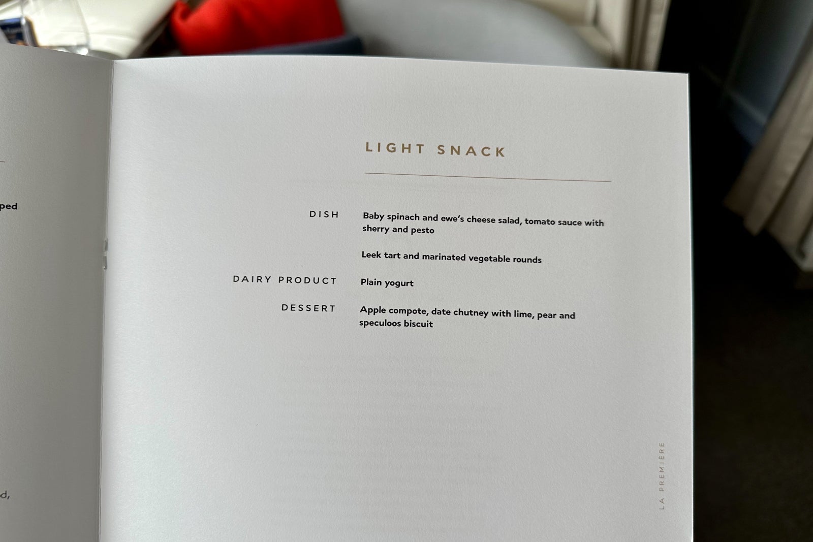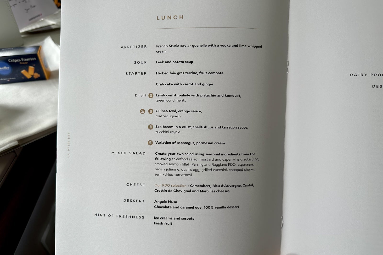 Given the 2:25 p.m. departure time, the menu included a full lunch service followed by a light snack before arrival. Though Air France offers dine-on-demand in first class, I opted to eat my main meal right after takeoff.