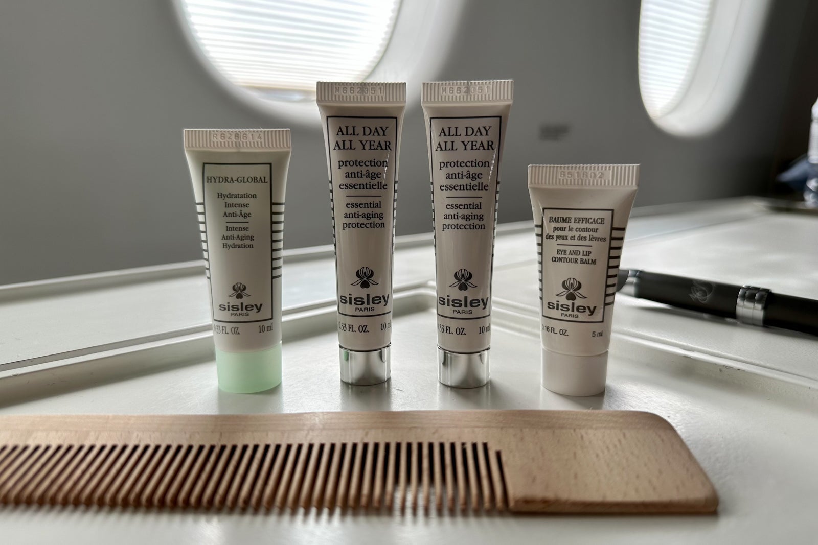 Waiting at my seat during boarding was a Sisley-branded amenity kit, which contained a bunch of sample-size creams and lotions, as well as a pen, bamboo comb, eyeshade, earplugs and headphone covers. The kit itself wasn't as stylish or as practical as some of the ones you'll find on other airlines (looking at you, United), but I definitely enjoyed the assortment of Sisley products.