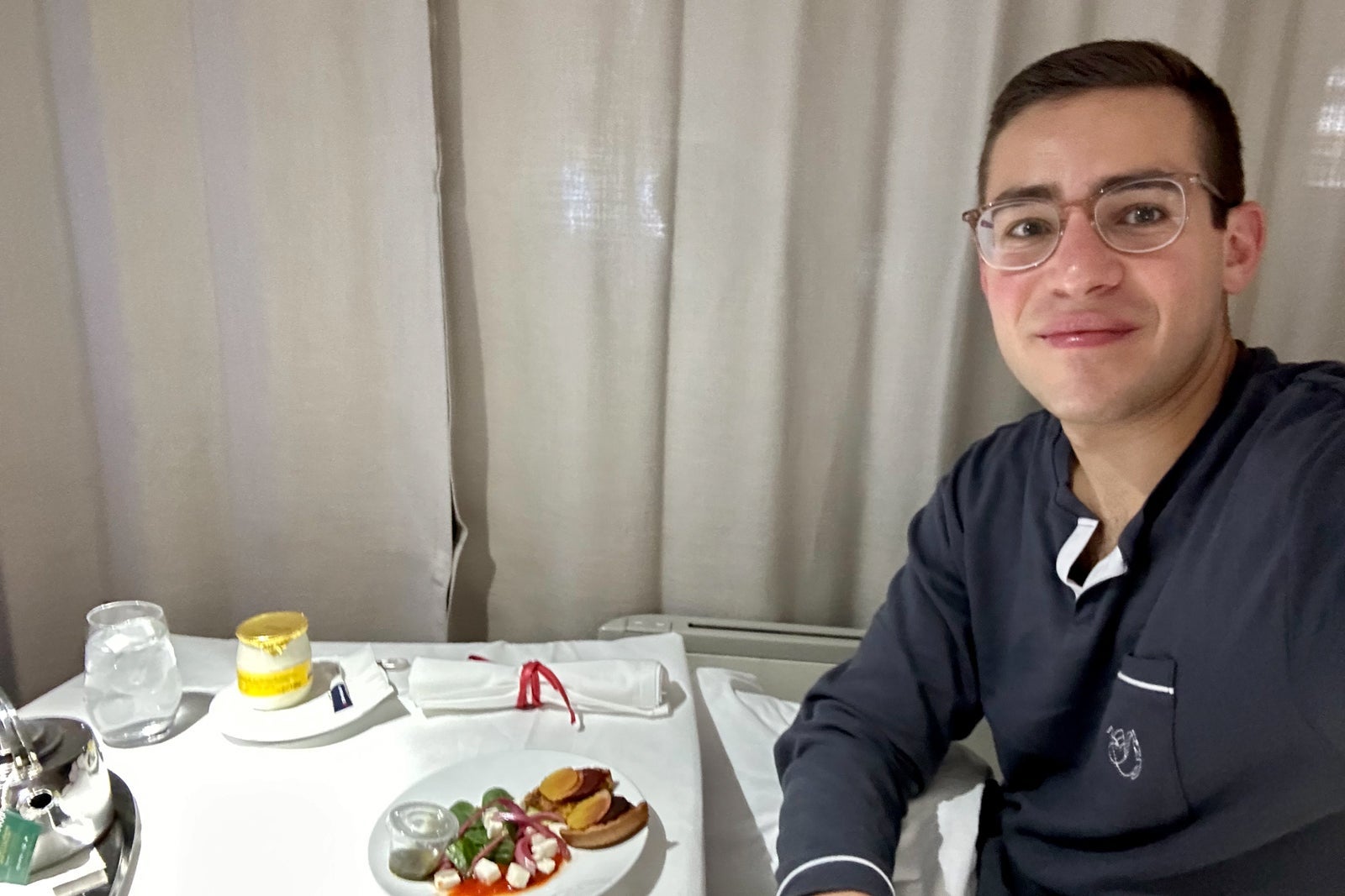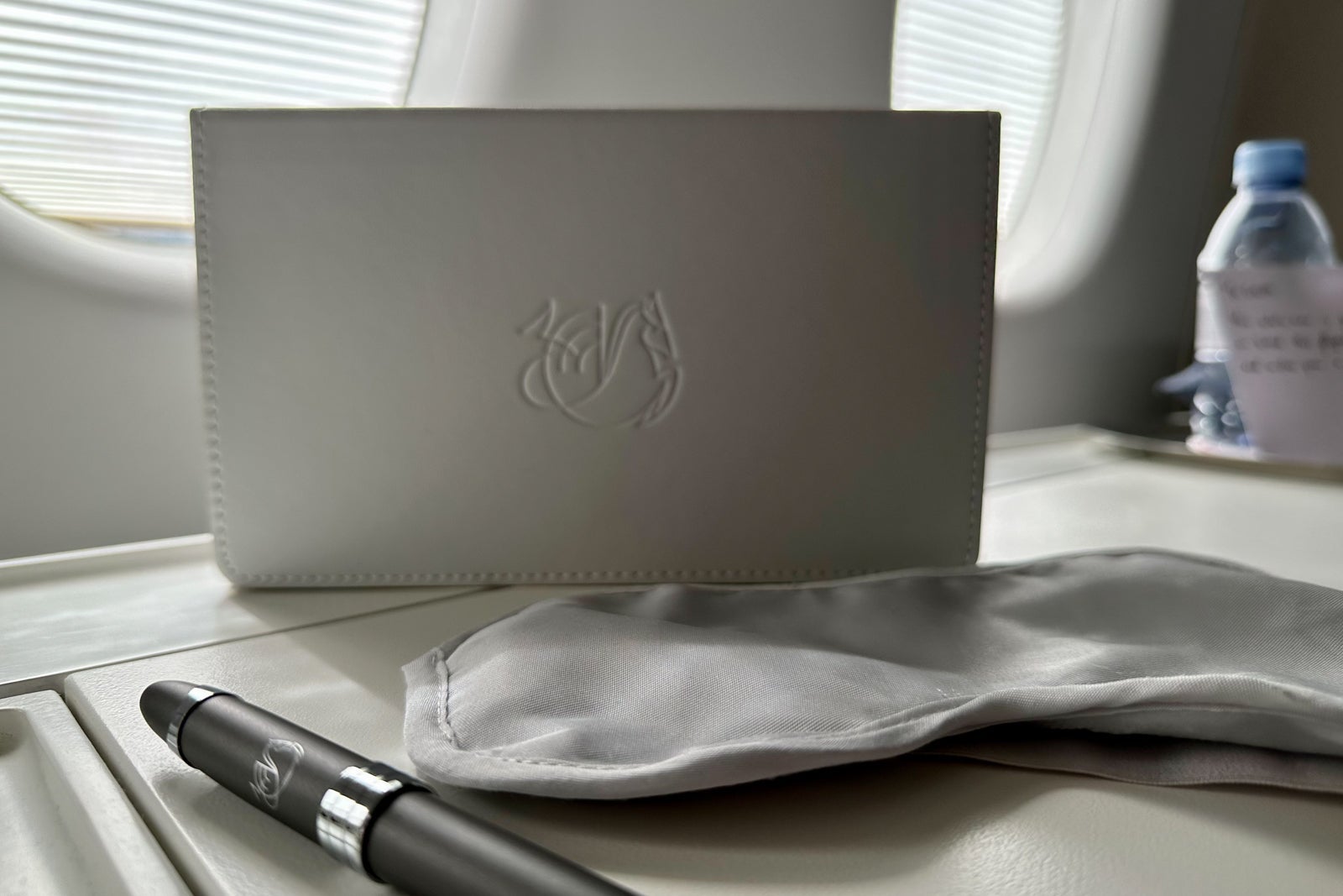Once I settled into my seat, the flight attendant introduced herself and offered me a pair of pajamas. While the chest pocket with the winged seahorse looked very luxurious, I didn't actually love the sleep set. It was a bit too scratchy for my liking, and the sizing and fit felt very European, with very tight pants and an awkward crop on the shirt.