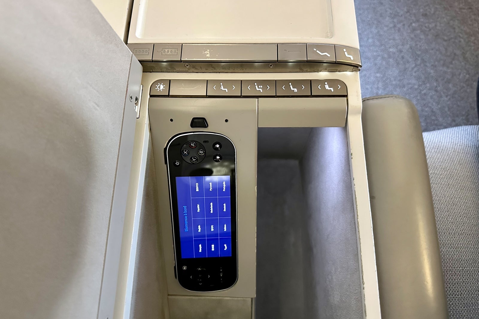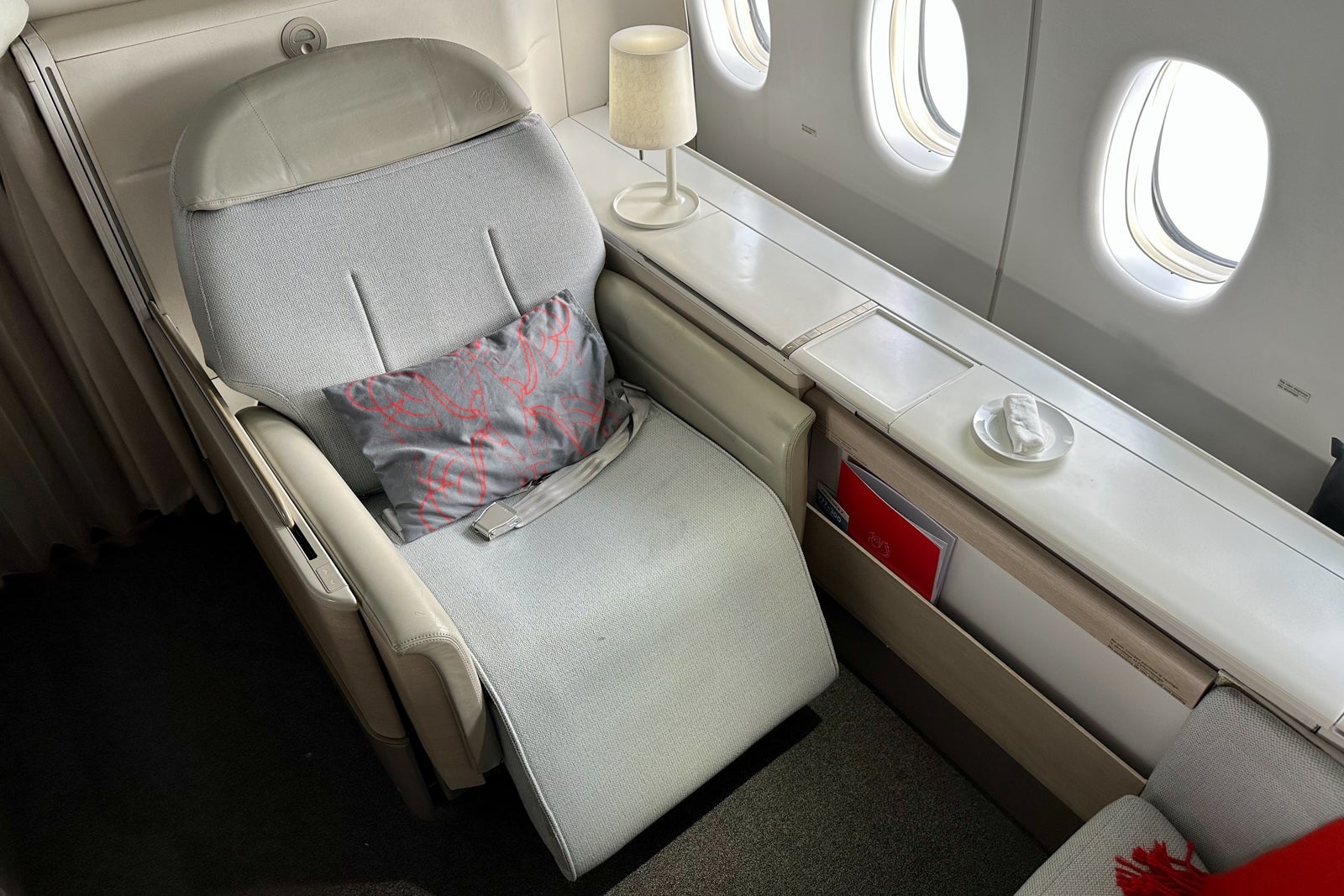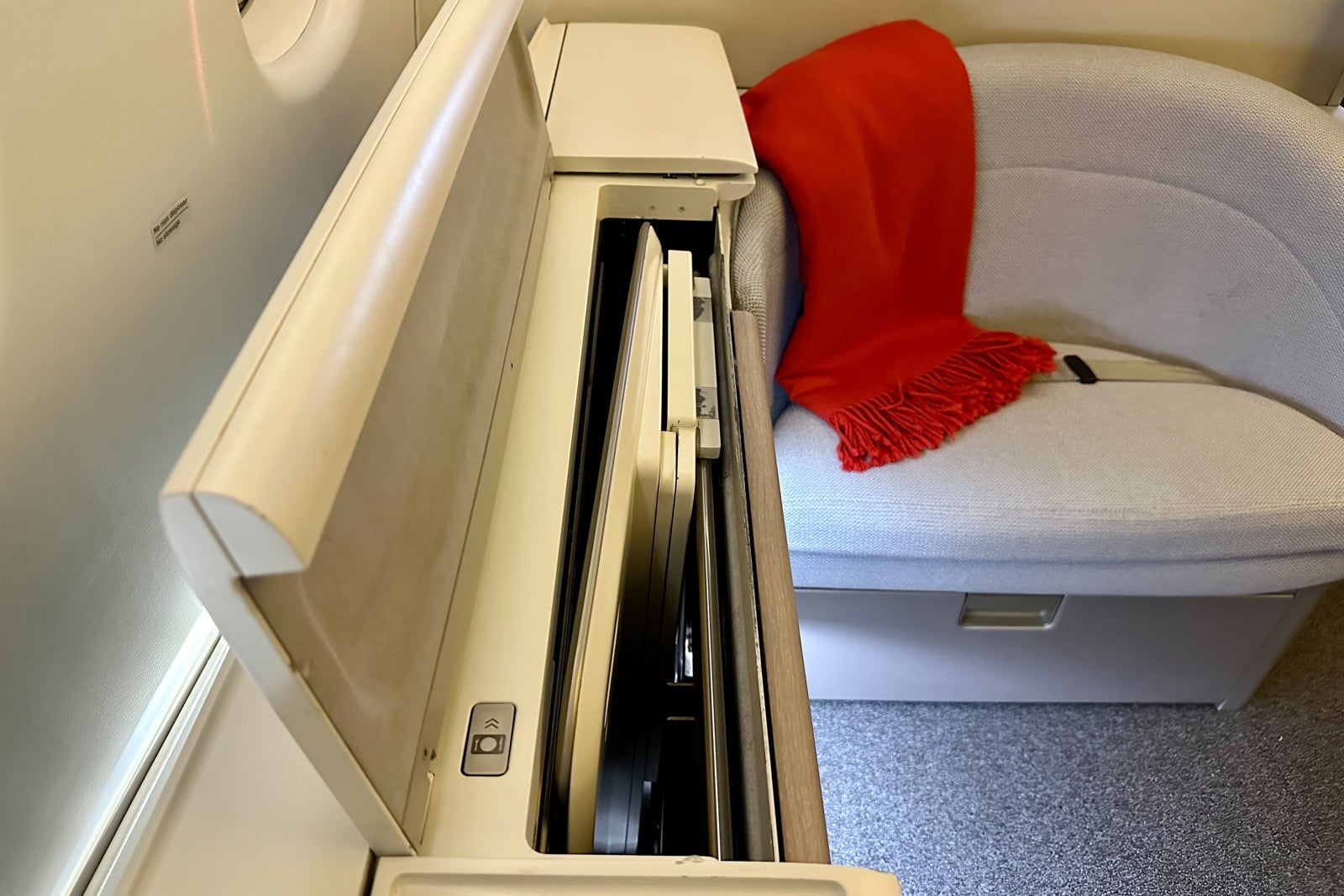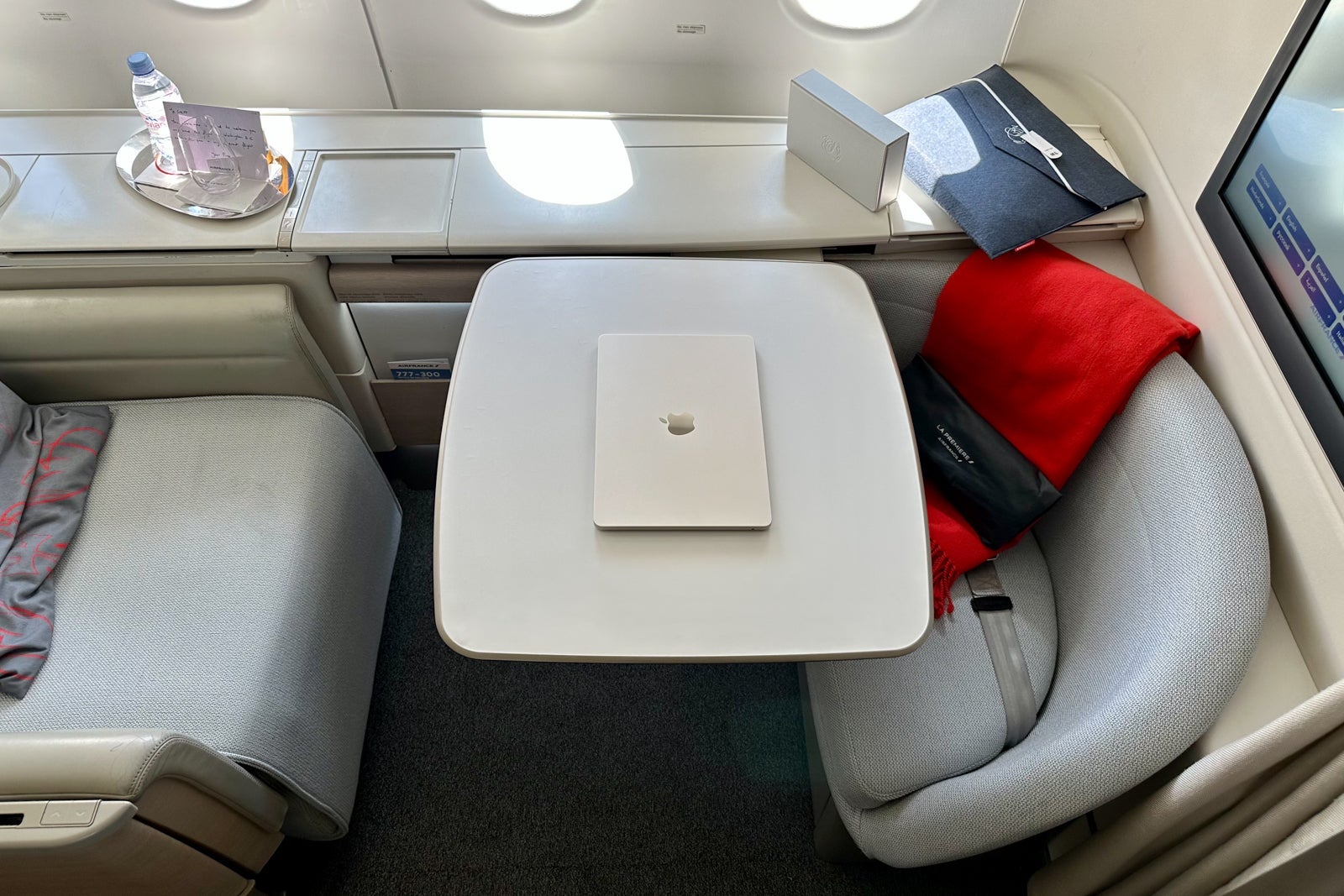 With crisp whites, beiges and red accents, the La Premiere cabin exudes French elegance, but my seat was a bit rough around the edges, with worn-out control buttons and areas of the 14-inch-wide side table that had been stained from years of use.