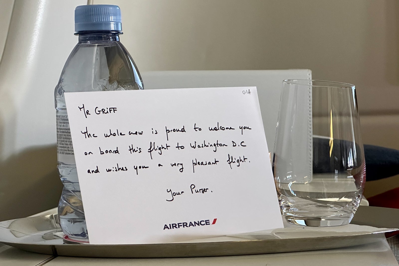 Service began with a silver-colored welcome tray that was waiting for me during boarding. It featured a small bottle of Evian water, a handwritten welcome card and a small box of cheddar cheese-filled savory crepes.