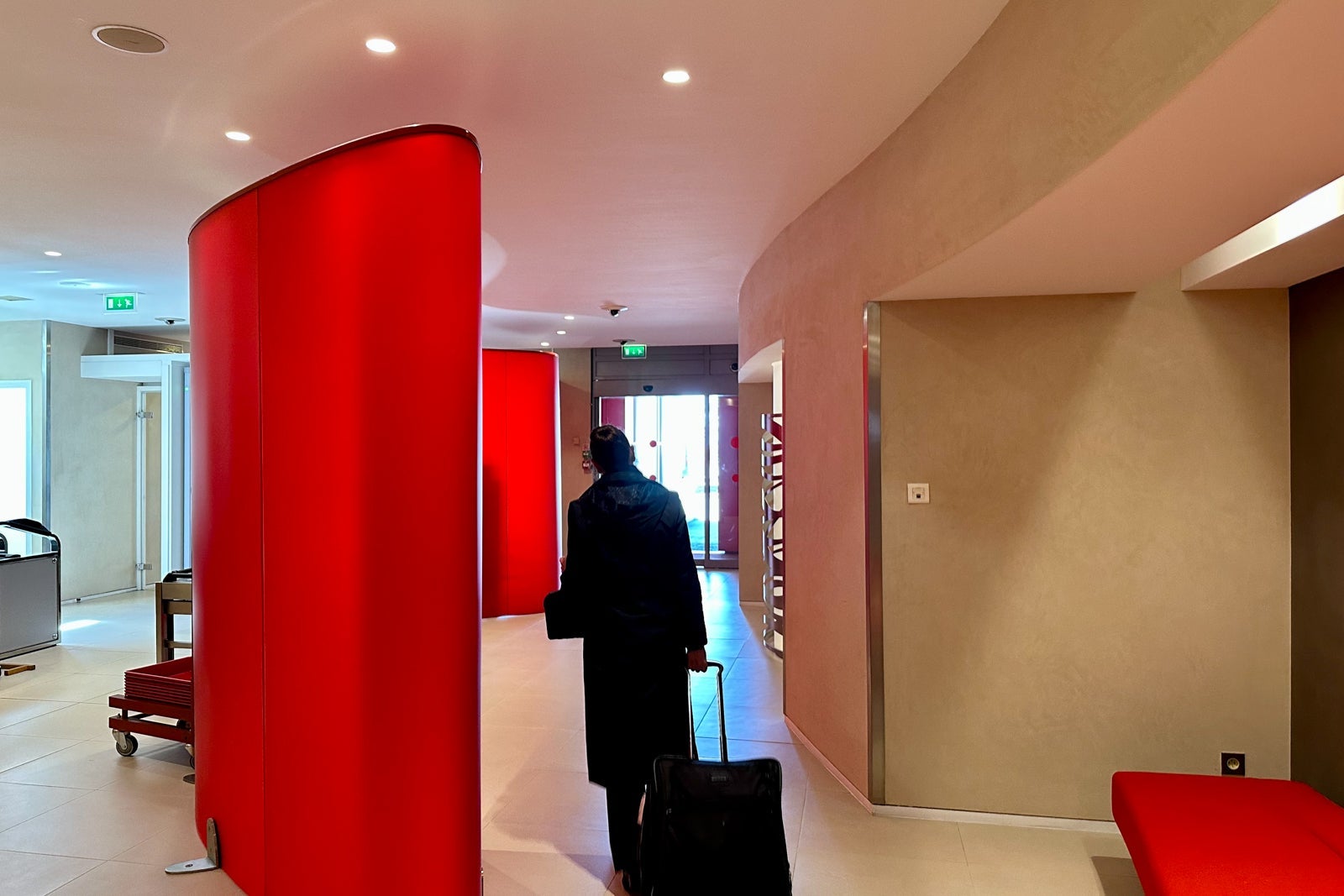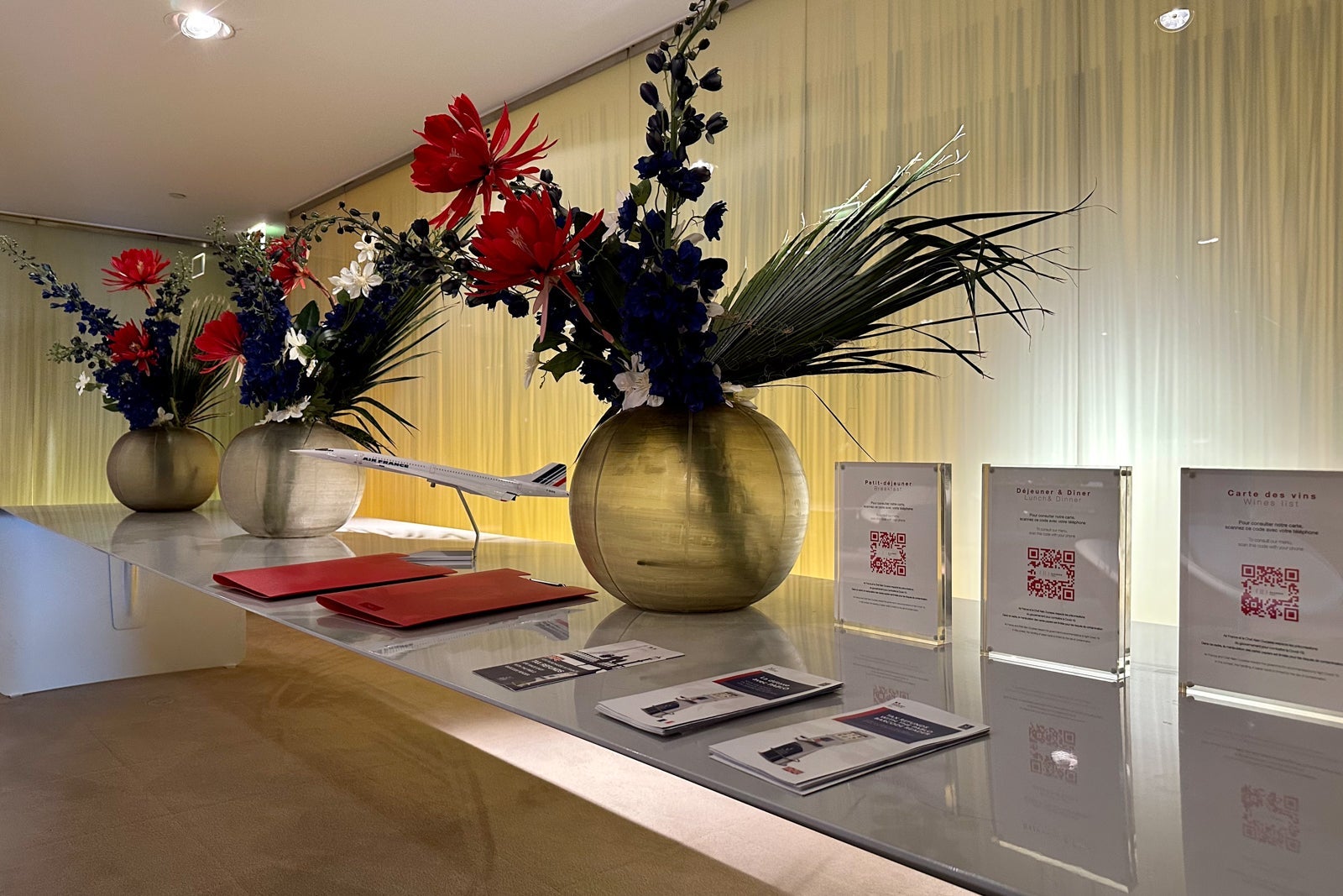I quickly made my way into the terminal and found the separate La Premiere check-in area. While some airlines offer dedicated lanes for first-class passengers, Air France has an entirely separate private check-in lounge, complete with comfy seats, backlit walls and fresh flower bouquets. There are even private restrooms here with a stylish light fixture separating the two spacious stalls.