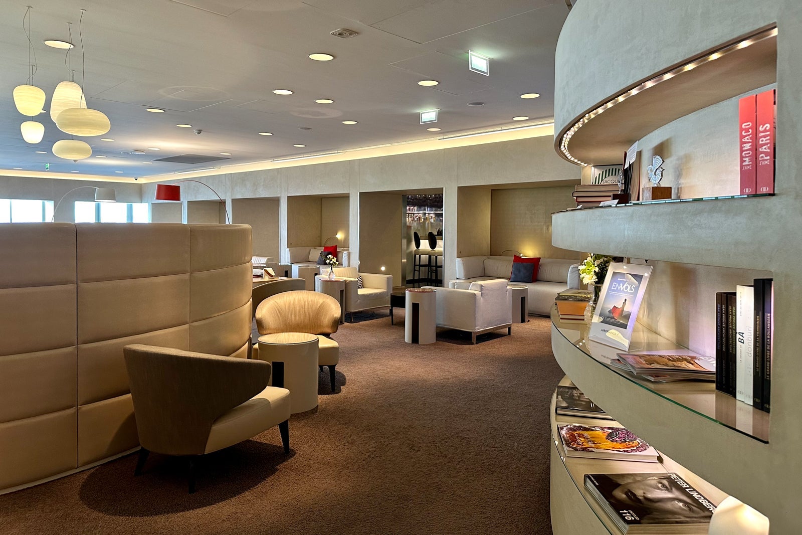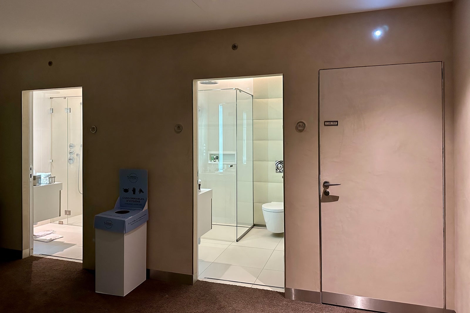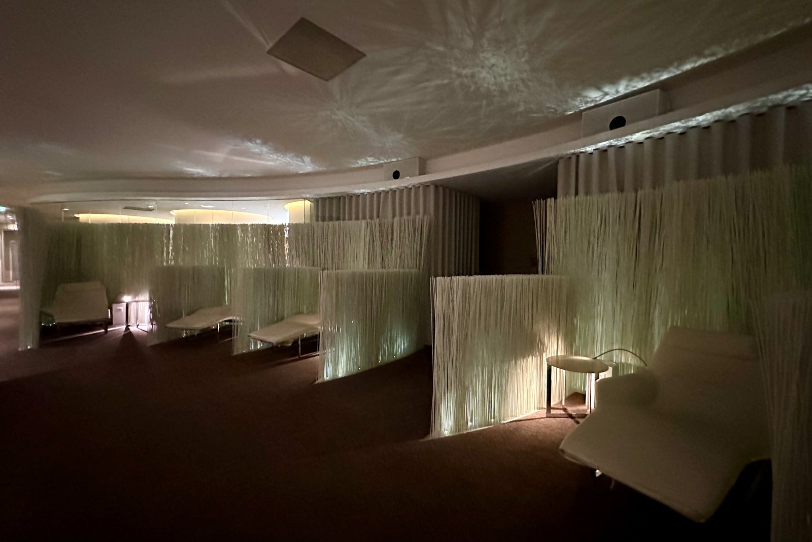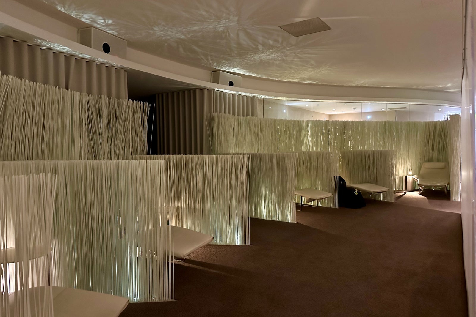 The rest of the lounge wraps around near the entrance. This includes separate men's and women's restrooms, a sleeping area, four shower suites and a Sisley-branded spa.