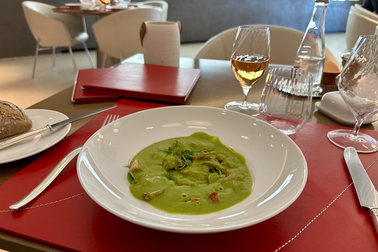I appreciated his suggestion, but as a pescatarian, I went with something else — the green pea veloute and the fillet of John Dory. I enjoyed my lunch with a glass of Champagne Barons de Rothschild Brut Rose.