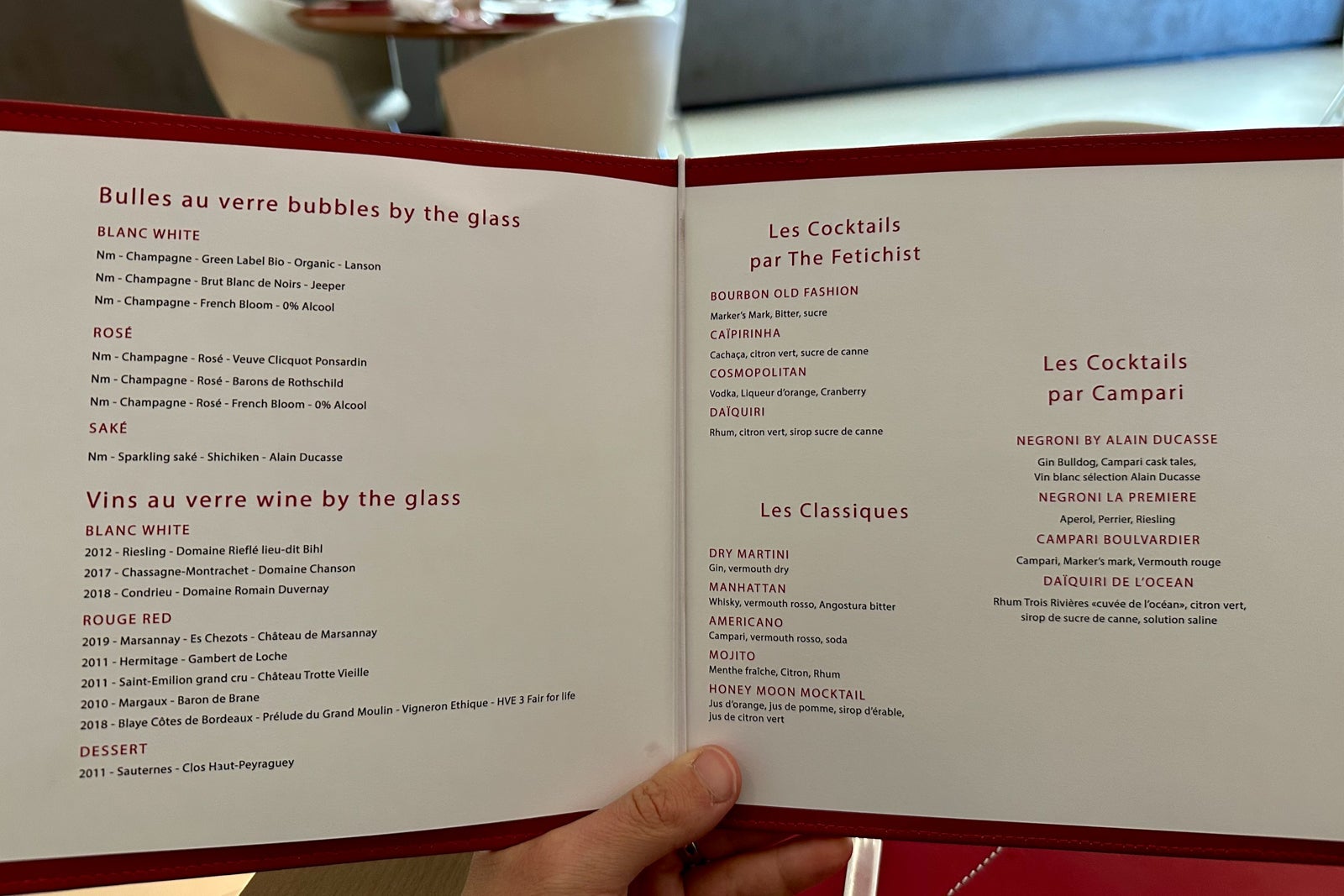 I then went back to the dining room to eat lunch, and was presented with menus from one of the friendly servers. Though there's a small buffet lining the dining room (complete with 11 different water choices), I saved my appetite for the a la carte dining experience, which is designed in partnership with chef Alain Ducasse, one of just two chefs in the world to have held over 20 Michelin stars.