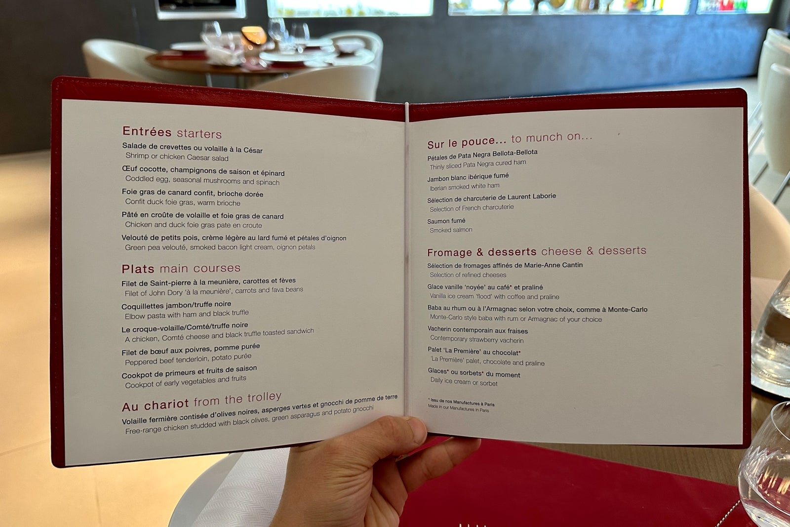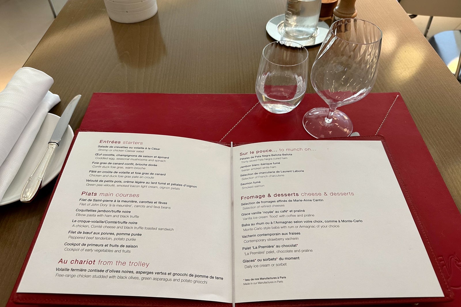 Menus printed on thick cardstock were then distributed during boarding, and I loved the design with the red La Premiere branding and the winged seahorse in the center.