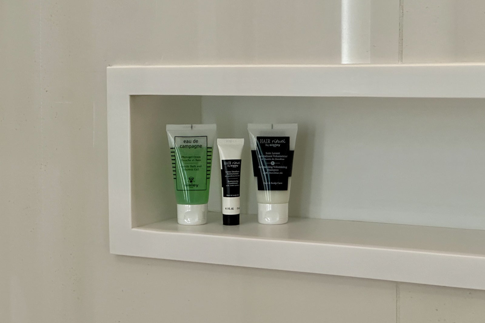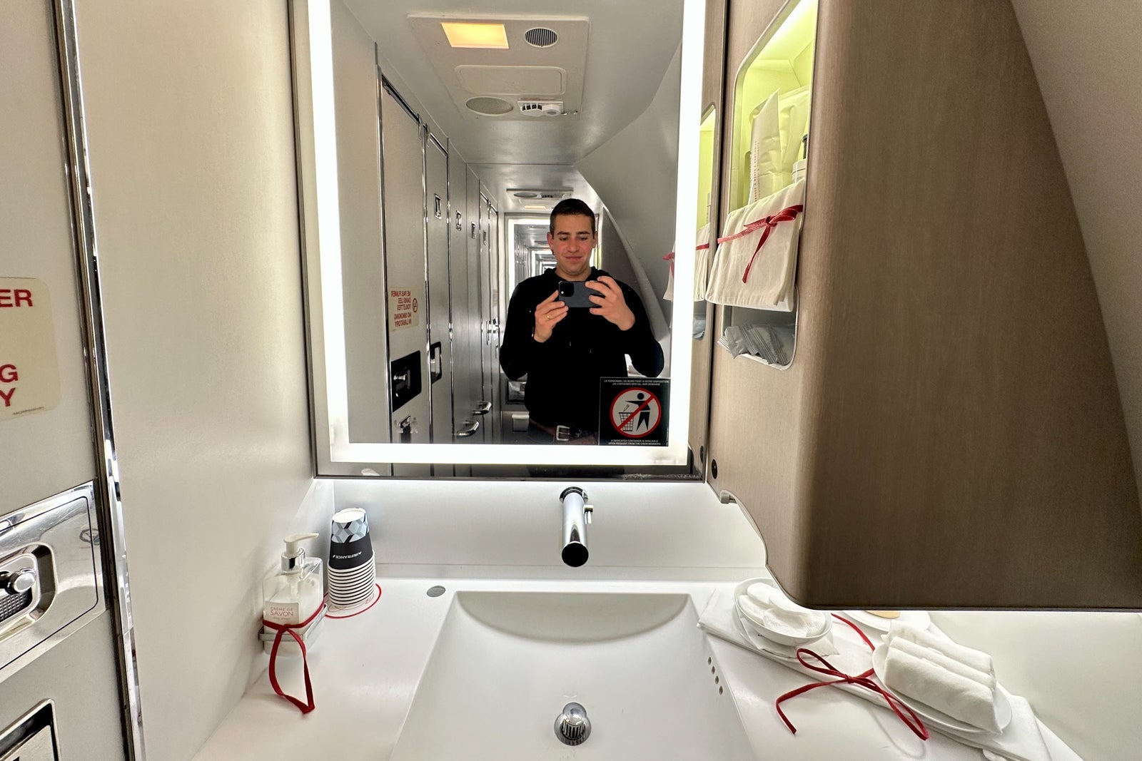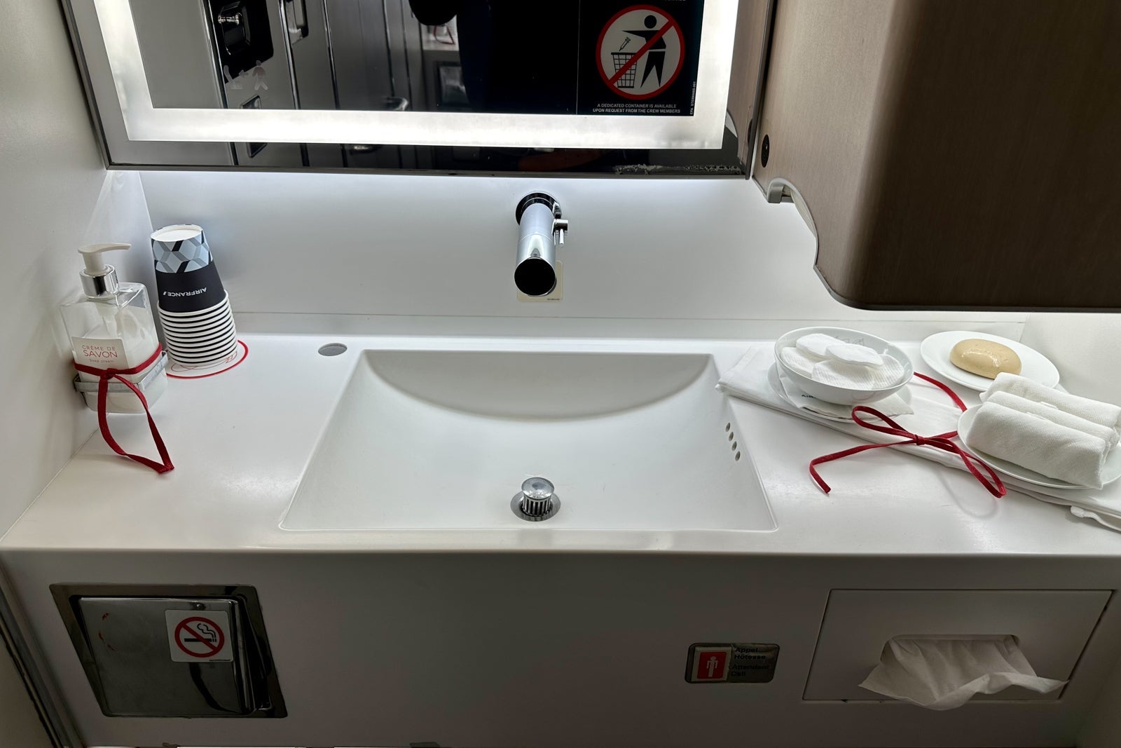 It's not as large as the bathrooms you'd find in first class on most Airbus A380s, but it is nicely appointed with Sisley-branded hand cream and makeup remover, as well as dental kits, cotton pads, linen towels and a no-touch tap.