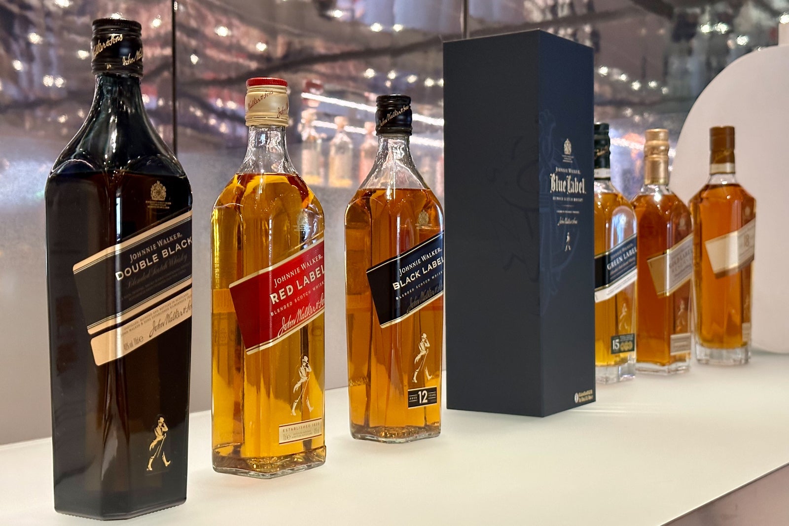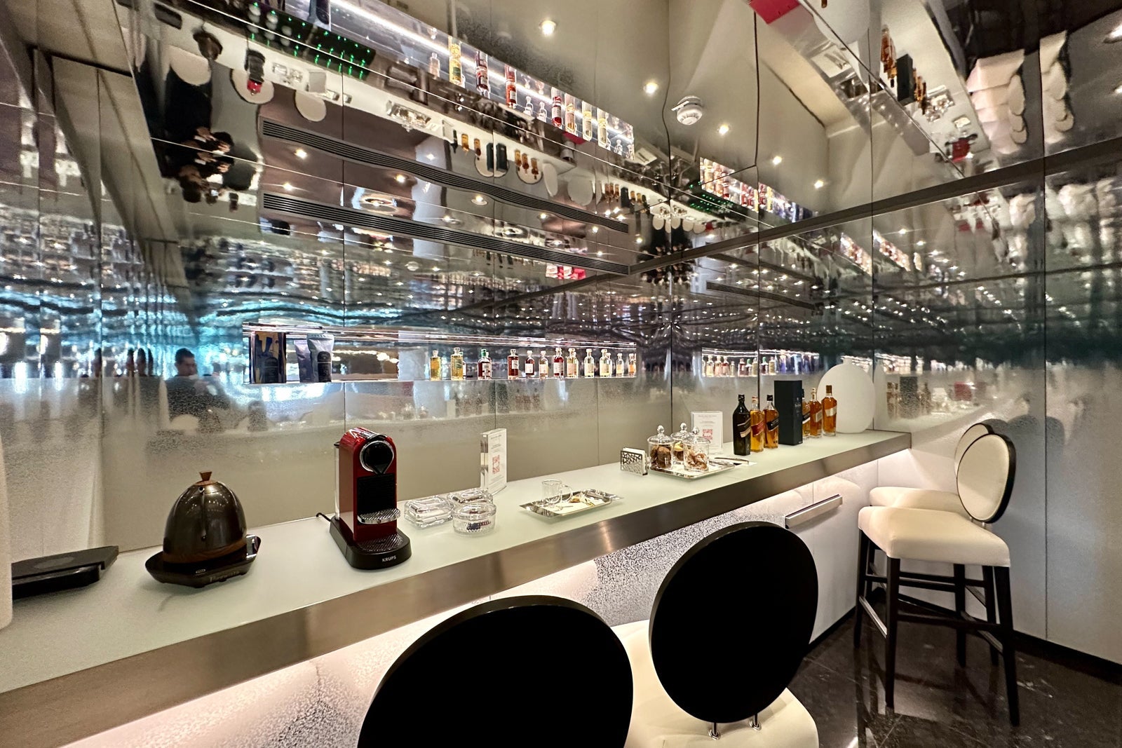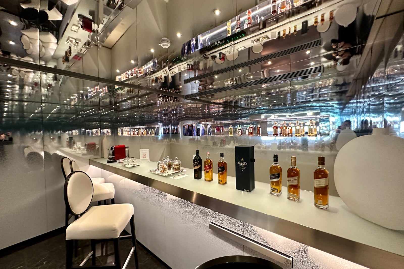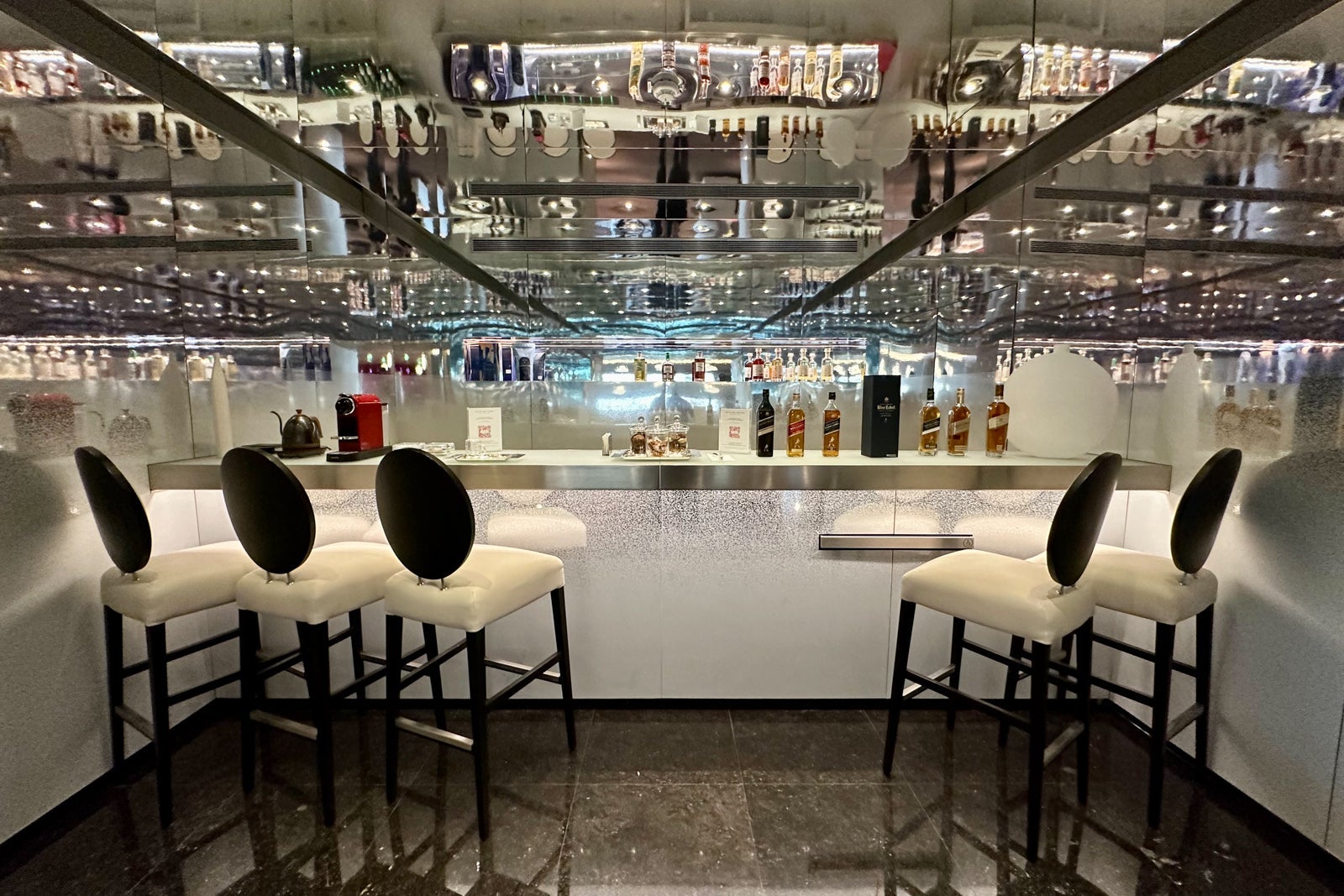 The main lounging area is split between an open dining room with a variety of two- and four-top tables and a relaxation space that features a small whiskey bar (offering an entire seven-bottle collection of Johnnie Walker, including Blue Label) with white and mirrored accents and an additional lounging room.