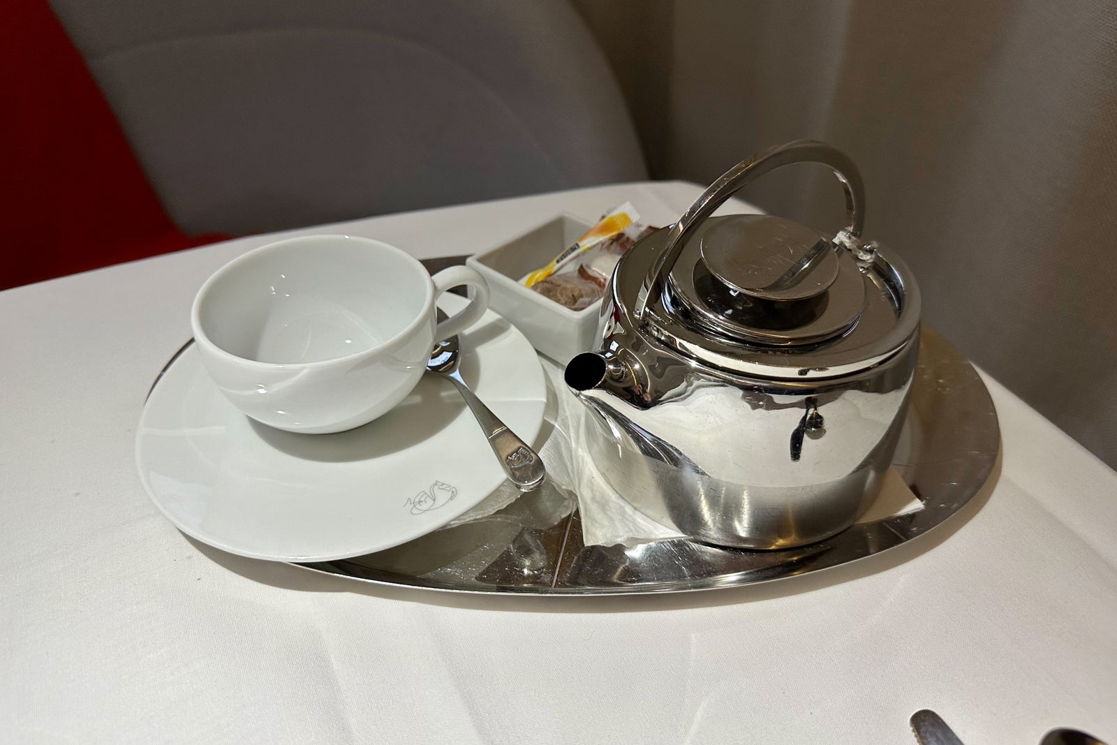 At this point, I was overstuffed, and I asked for a pot of mint tea to conclude the meal. It was served with a personal kettle that also had the winged seahorse on top of it — Air France really knocked it out of the park with the branding.