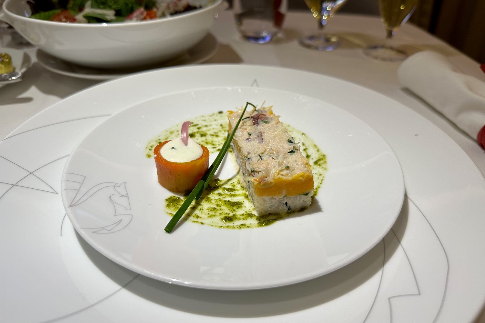 Afterward, my tray table was unlatched and set with a thick white linen tablecloth and tableware, including a large winged seahorse charger — I wish I could've taken this dish home.