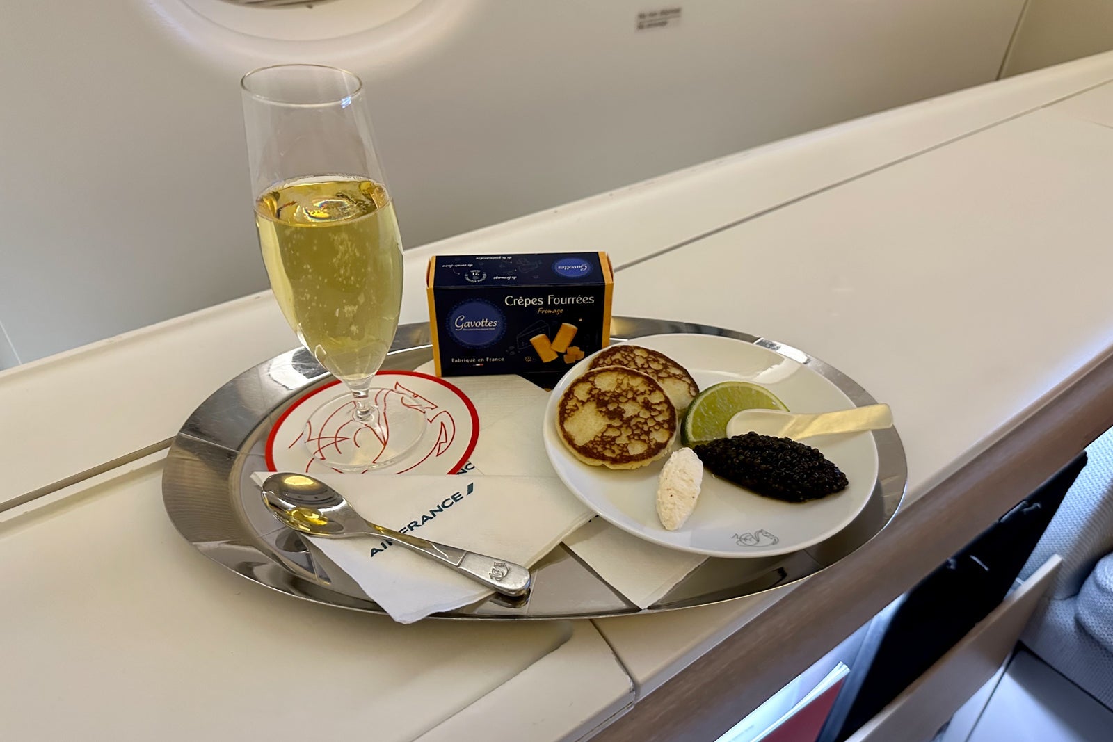The French Sturia caviar was served directly on a plate, and the dollop I received was a pretty respectable size. The flight attendant offered seconds, but I declined.