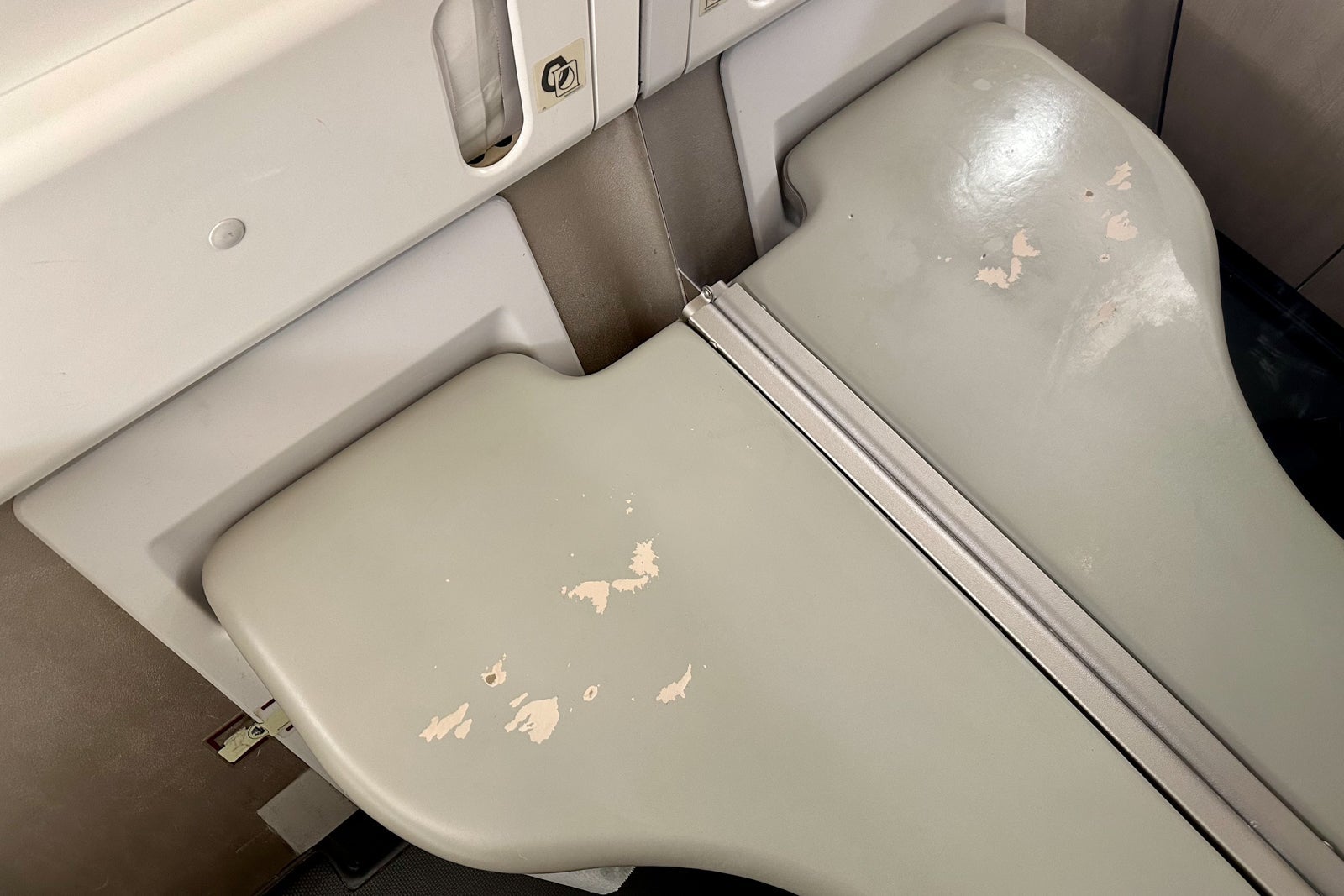 There is a changing table in the lavatory, but with some peeling and discolored leather, it has certainly seen better days.