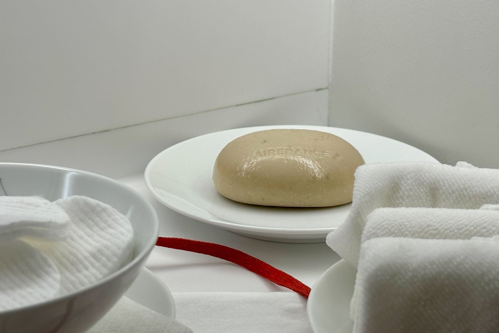 I wasn't sure why Air France thought that offering a shared bar of soap would be fitting for a first-class lavatory, but I stuck to the liquid soap dispenser anyway.